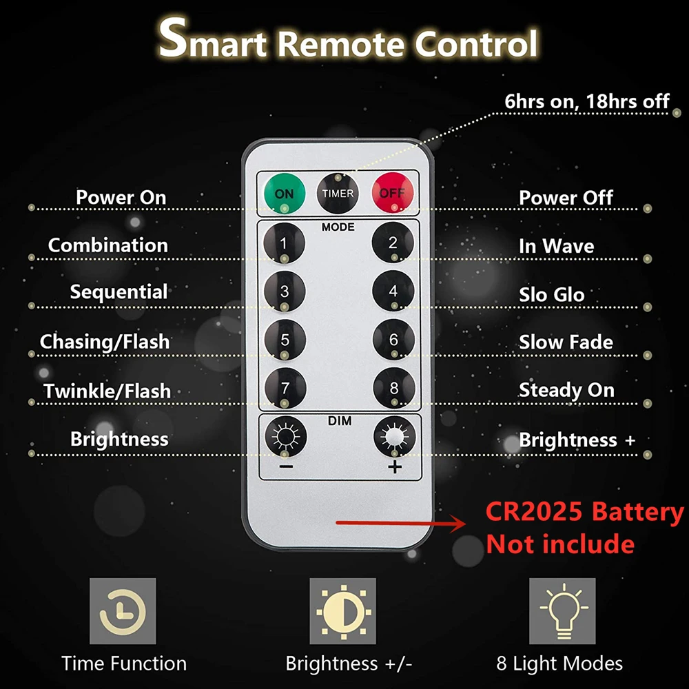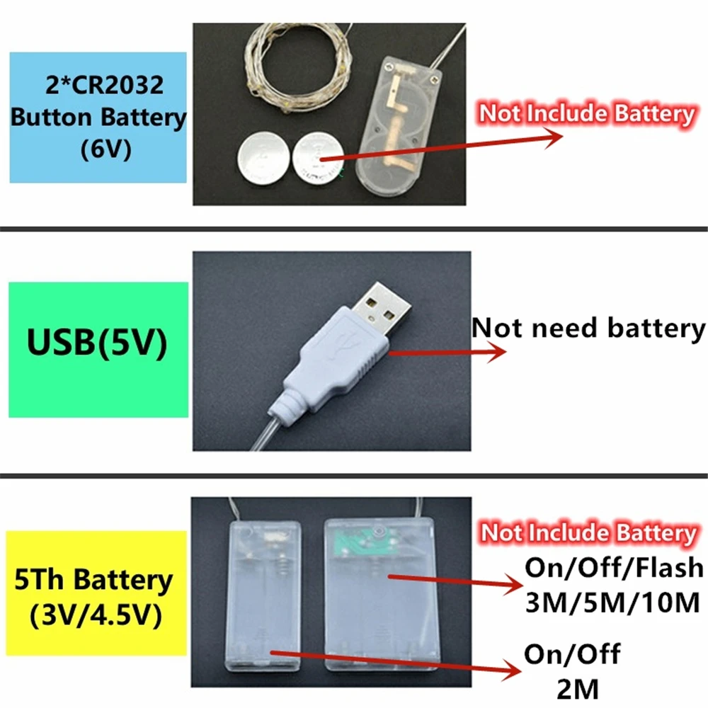 ① Кнопочный светильник: 3 * CR2032 Battery-1M/2 м/3 м/5 м/10 м ВКЛ/ВЫКЛ② Светильник в маленькой коробке: 3 * LR44 Battery-1M/2 м-устойчивый/Быстрый мигающий/медленный мигающий③ Пробковый светильник: 3 * LR44 Battery-1M/2 м-ВКЛ/ВЫКЛ④ USB светильник: 2 м/3 м/5 м/10 м⑤ Светильник батареи AA: 1⃣2*5 Battery-2M-ON/выкл⃣3*5Th Battery-3M/5M/10M ON/OFF/FLASHUSB пульт дистанционного управления USB: 5 м/10 м-8 режимовAA пульт дистанционного управления батареей AA: 10 м-8 режимов