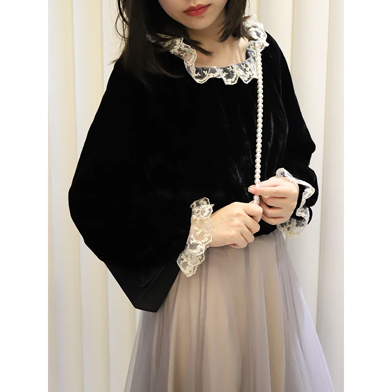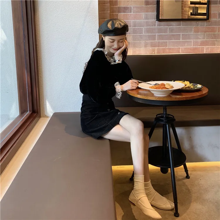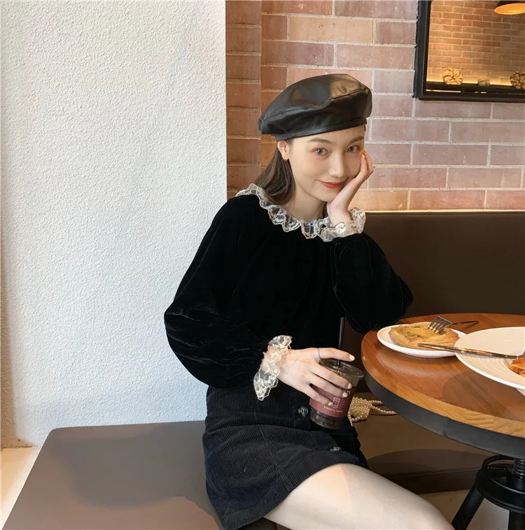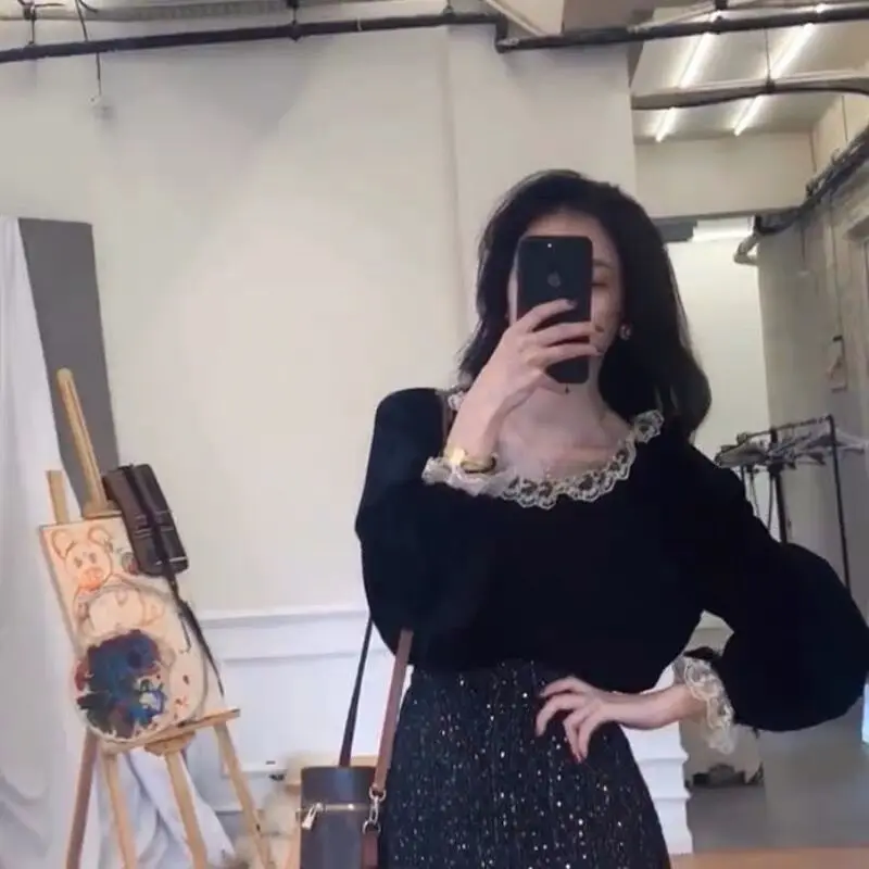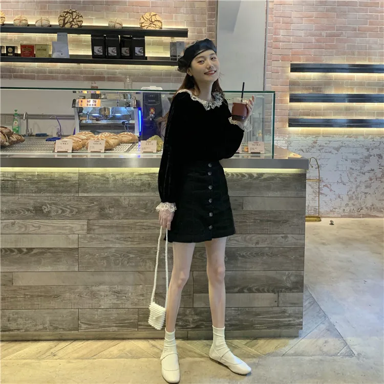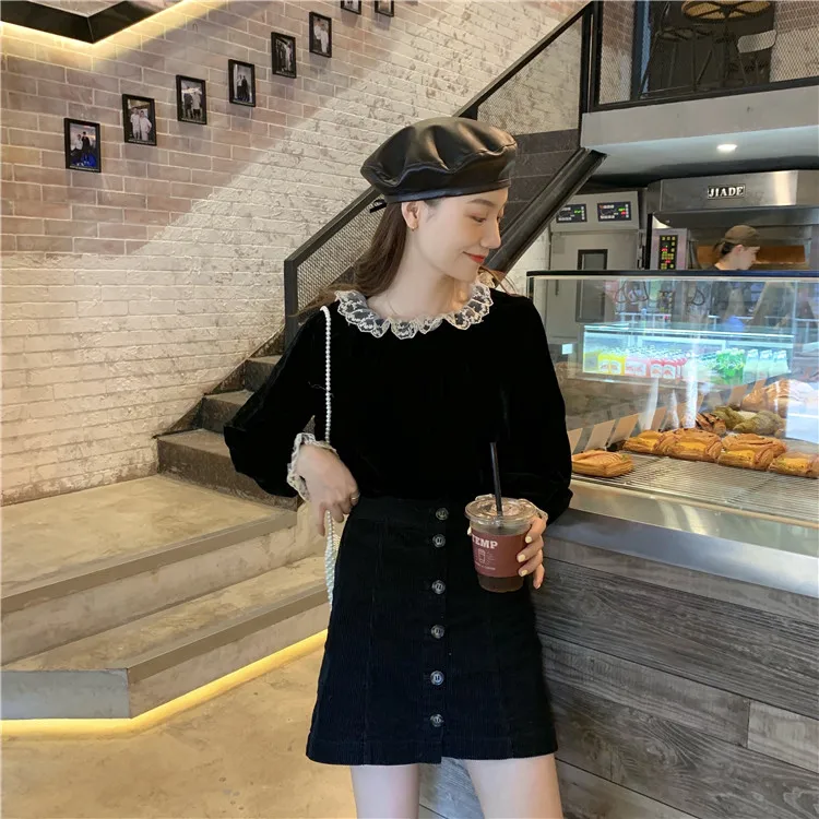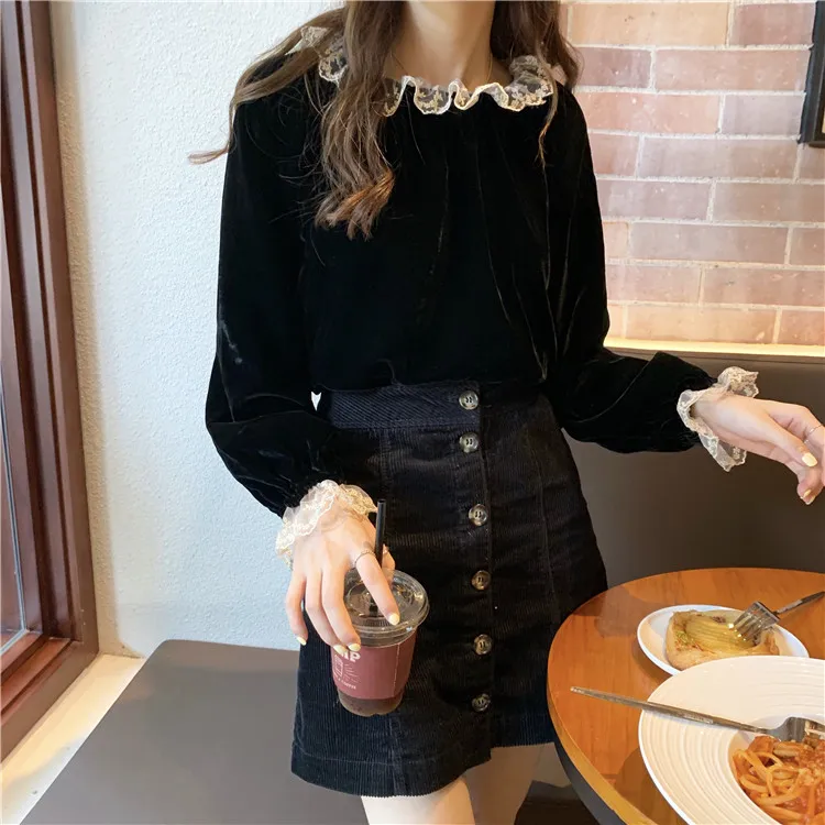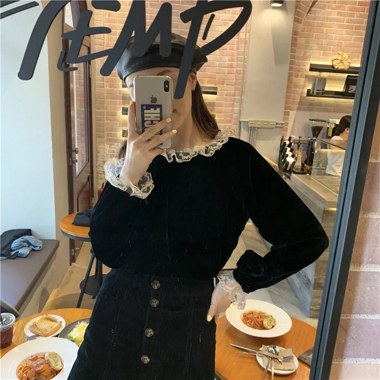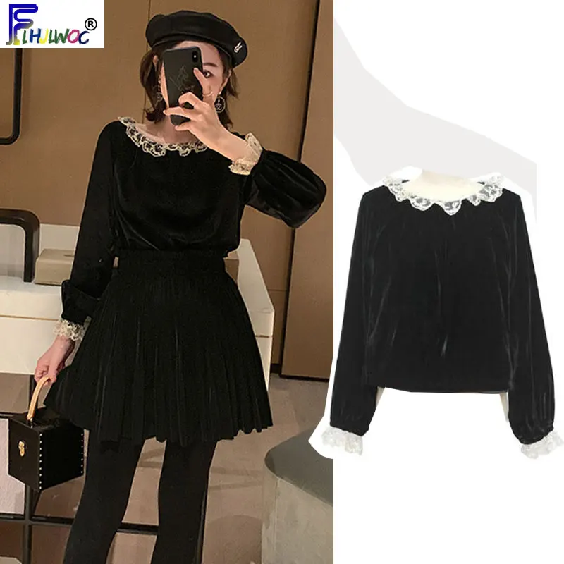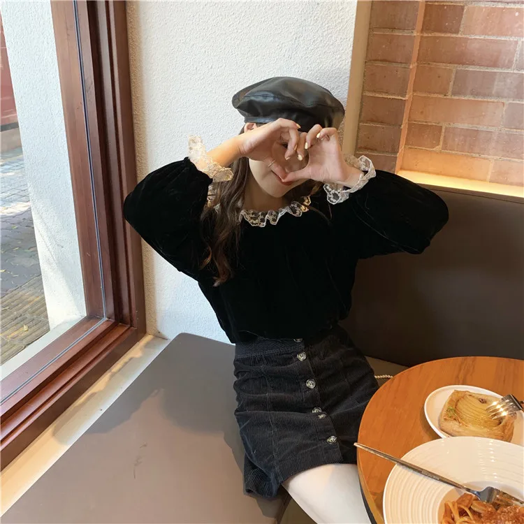 Укороченный женский топ с кружевом, базовый модный белый топ с расклешенными рукавами, милая дизайнерская черная футболка с оборками в Корейском стиле, зима