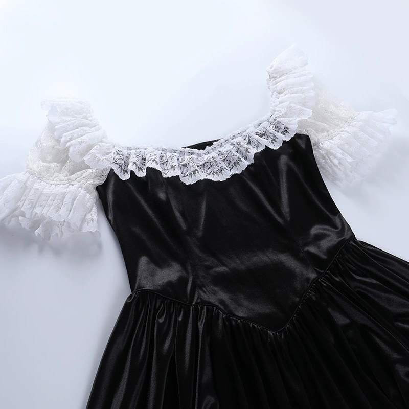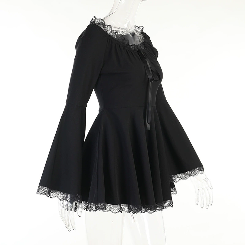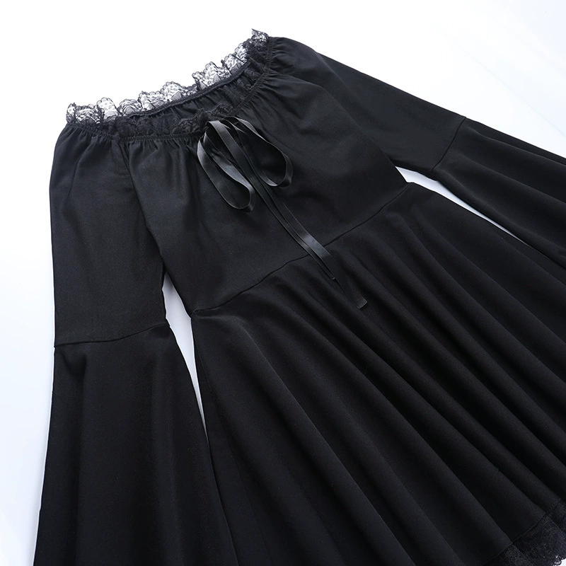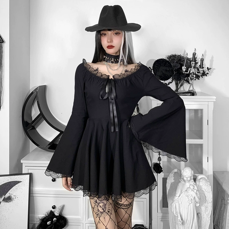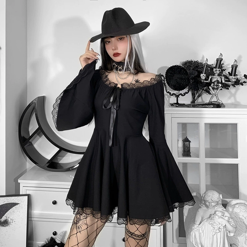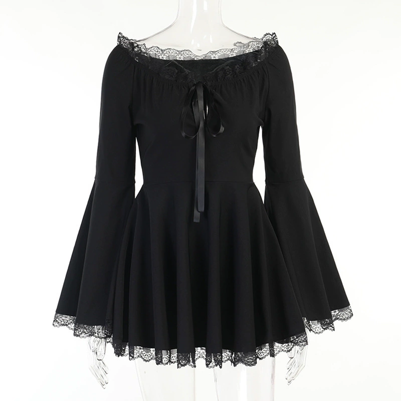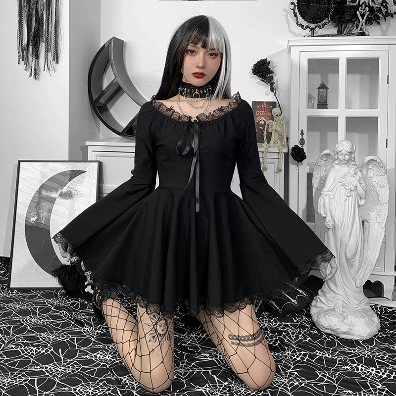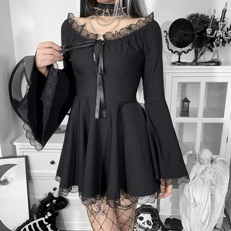 Женское платье с вырезом лодочкой, однотонное черное платье в готическом стиле с пышными рукавами, кружевной подол с длинными расклешенными рукавами, размеры S, M, L, 2019