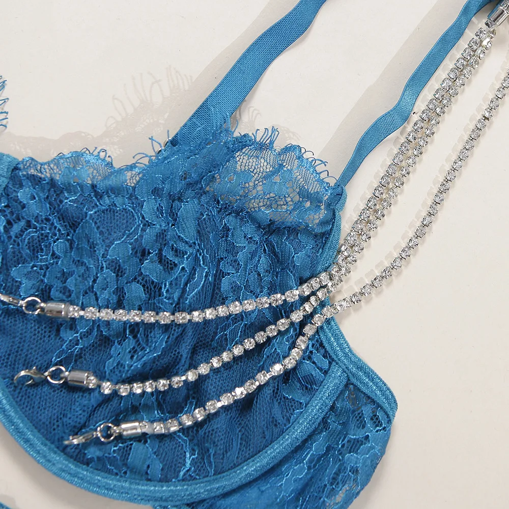 Сексуальное женское белье ультра-тонкий прозрачный кружевной комплект с украшением в виде кристаллов цепи комплект с кружевным бюстгальтером для женщин 3 шт.компл. бюстгальтер + щипцы + подвязки, сексуальное нижнее белье