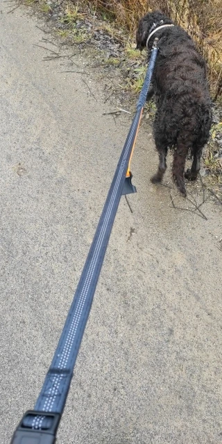 Отличный добротный прочный поводок. С таким очень удобно бегать собакой - руки свободные. Отличный плотный материал, не клеенка. Хватит надолго. Поводок прорезиненный и хорошо растягивается.