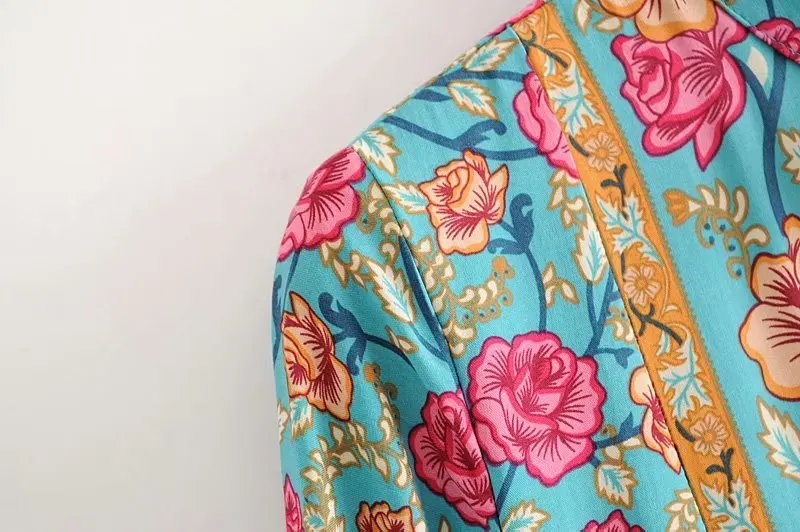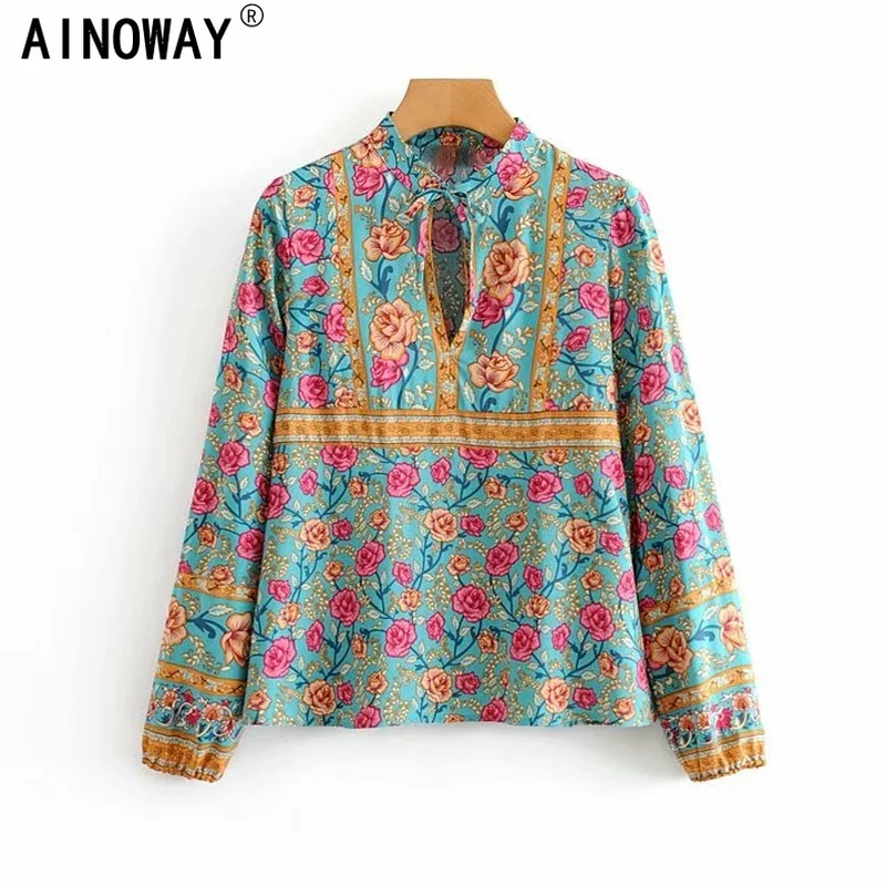 Винтажная шикарная Женская богемная блузка с цветочным принтом и V-образным вырезом, рубашки на шнуровке, женские рубашки с длинным рукавом из вискозы, хлопковая рубашка в стиле бохо, блузы