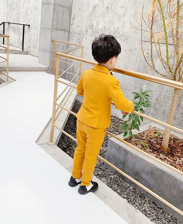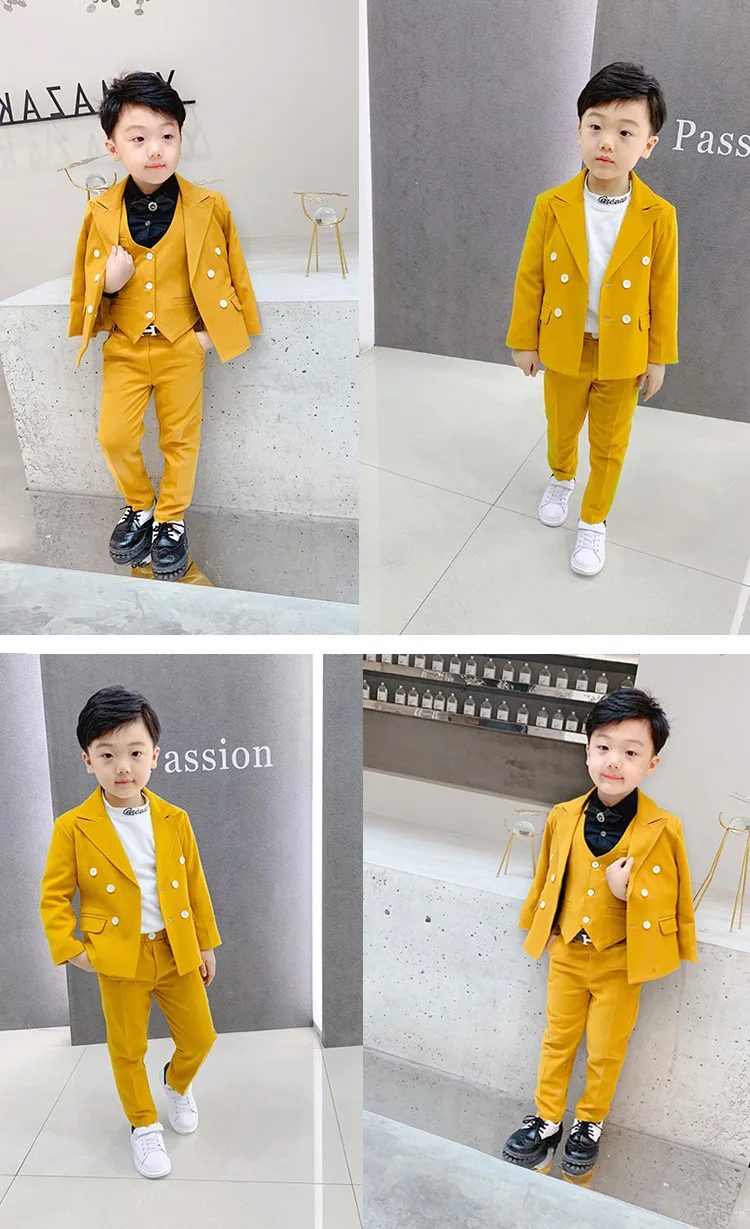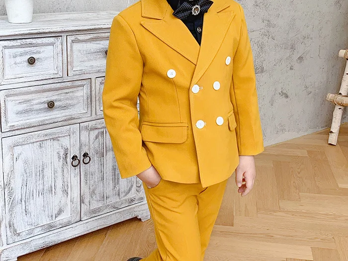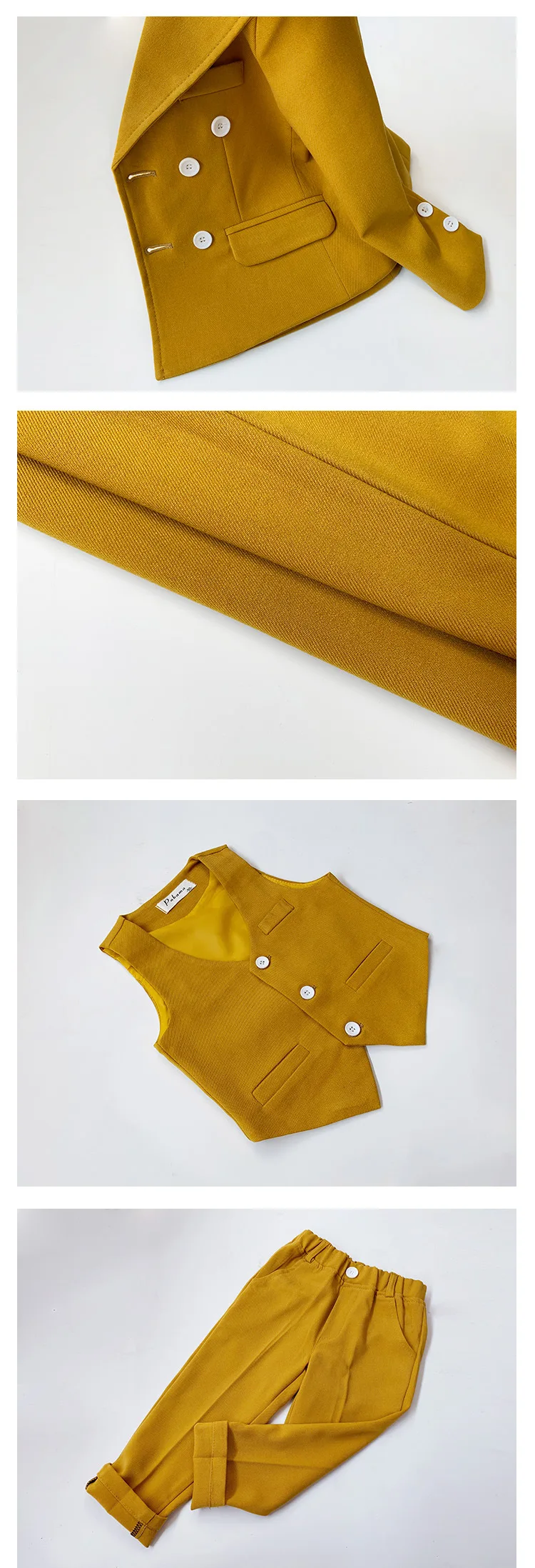Зимний костюм с платьем для мальчиков и девочек, формальный Детский костюм для свадебной вечеринки детский желтый Блейзер, жилет, штаны, комплекты одежды