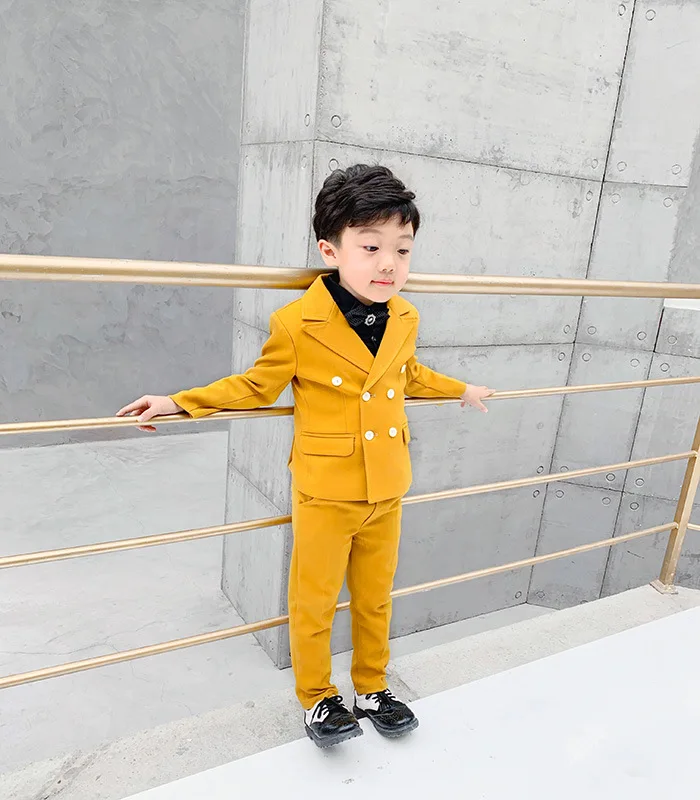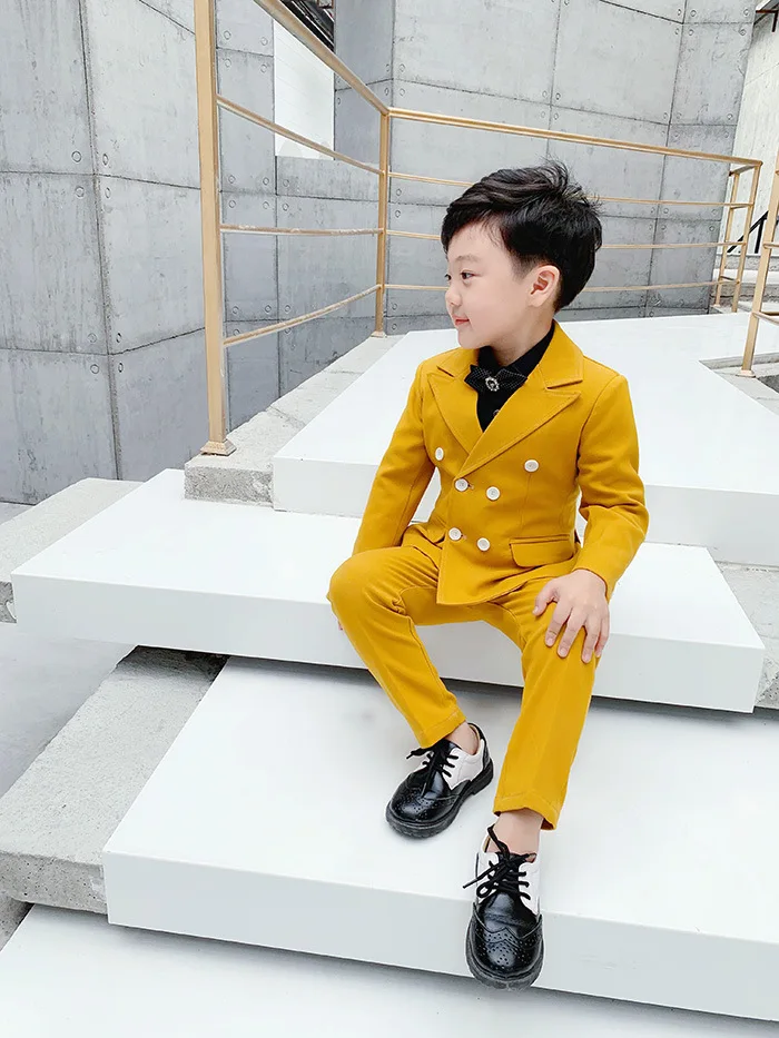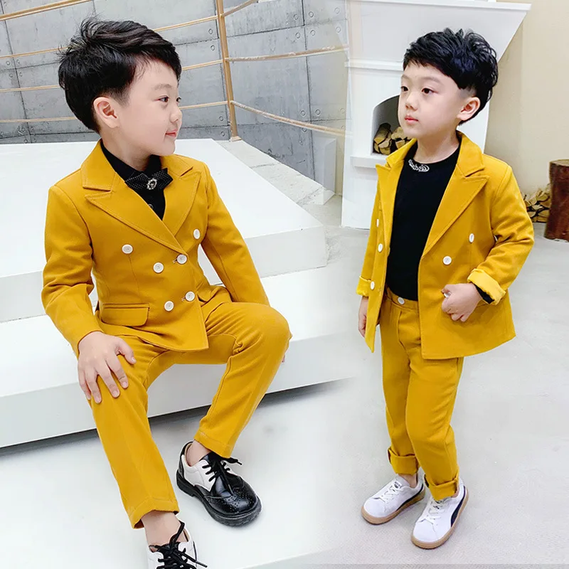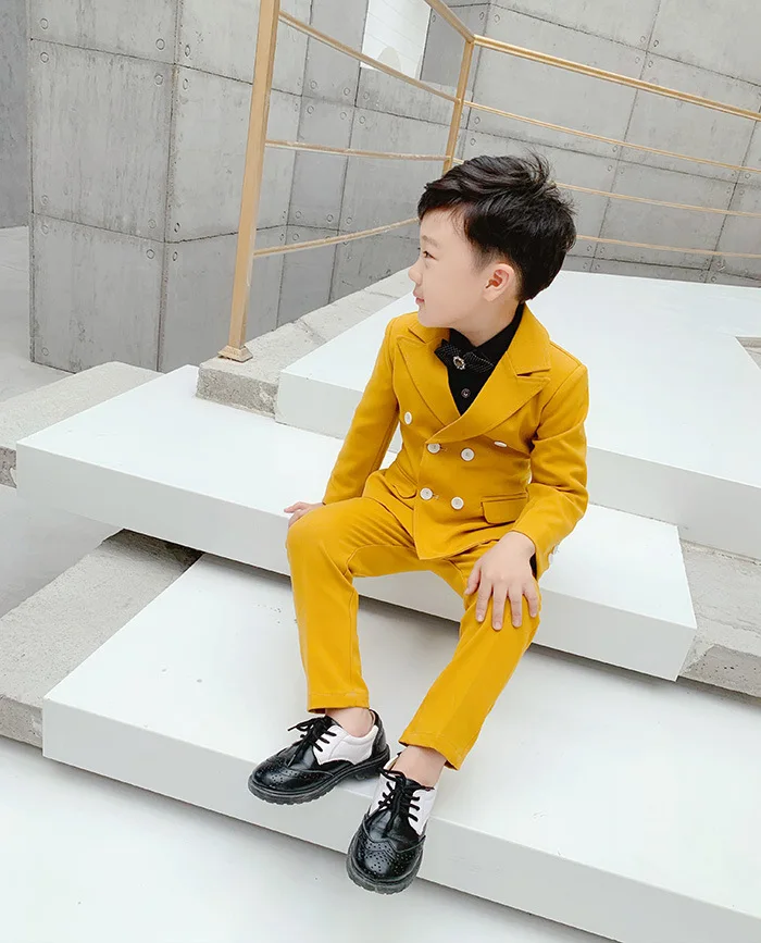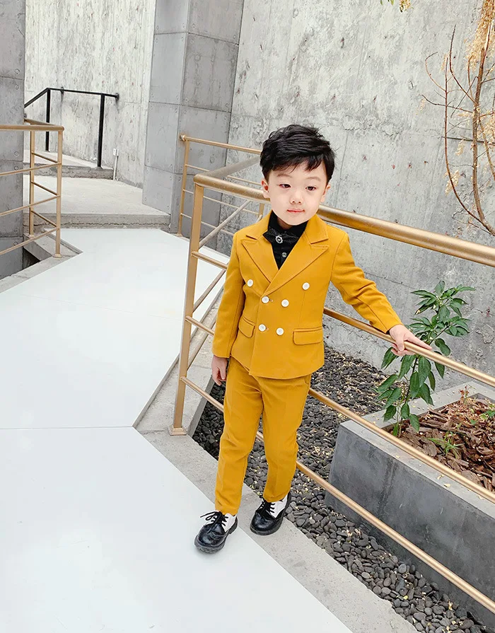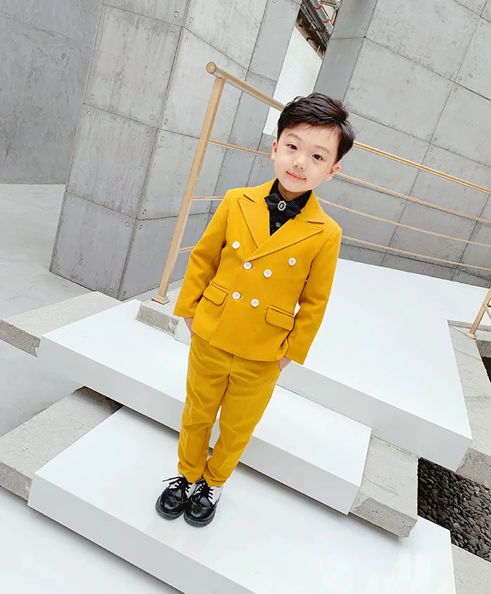 Зимний костюм с платьем для мальчиков и девочек, формальный Детский костюм для свадебной вечеринки детский желтый Блейзер, жилет, штаны, комплекты одежды