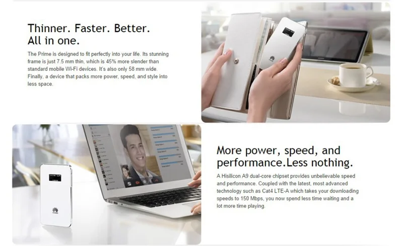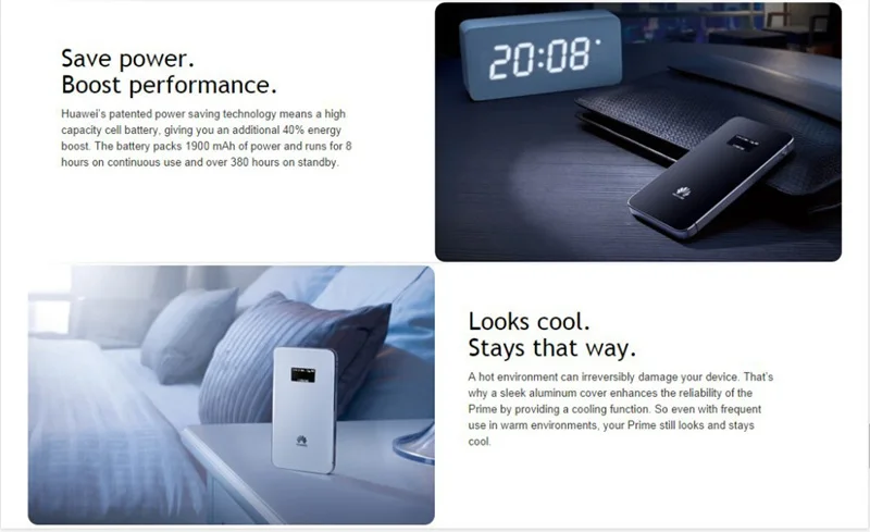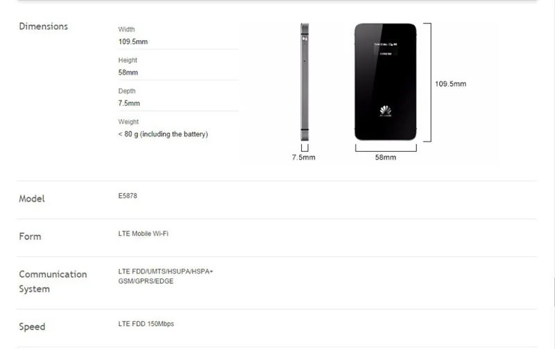 Использование технологии нано-формования (NMT), которая сочетает металл с полимером в бесшовном материале, huawei E5878 является самым тонким 4G Мобильный Wi-Fi, который измеряет 7,5 мм толщиной и 109,5 мм длиной и шириной 58 мм. Эта Мобильная точка доступа E5878 может оставаться в сети до 8 часов использования в режиме LTE или 380 часов в режиме ожидания, обеспечиваемом аккумулятором с питанием от 1900 мА · ч. Он также может обеспечить надежное подключение WiFi для устройств до 10 в диапазоне 100 метров-беспроводной терминал amulti-mode для SOHO и бизнес-профессионалов.