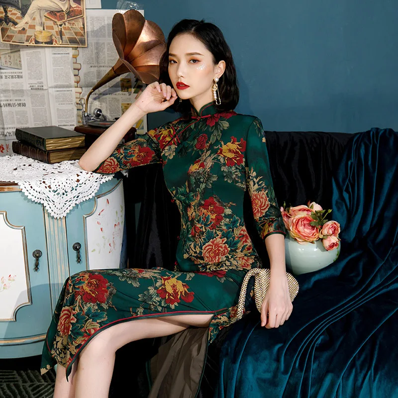 Женское винтажное платье Ципао Sheng Coco, зеленое платье в китайском стиле с длинным рукавом, традиционное китайское платье в восточном стиле 4XL 5XL размера плюс