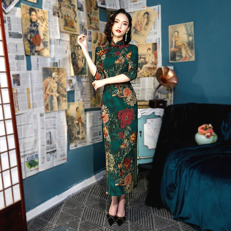 Китайское платье Ципао, длинное шелковое элегантное традиционное пл...
