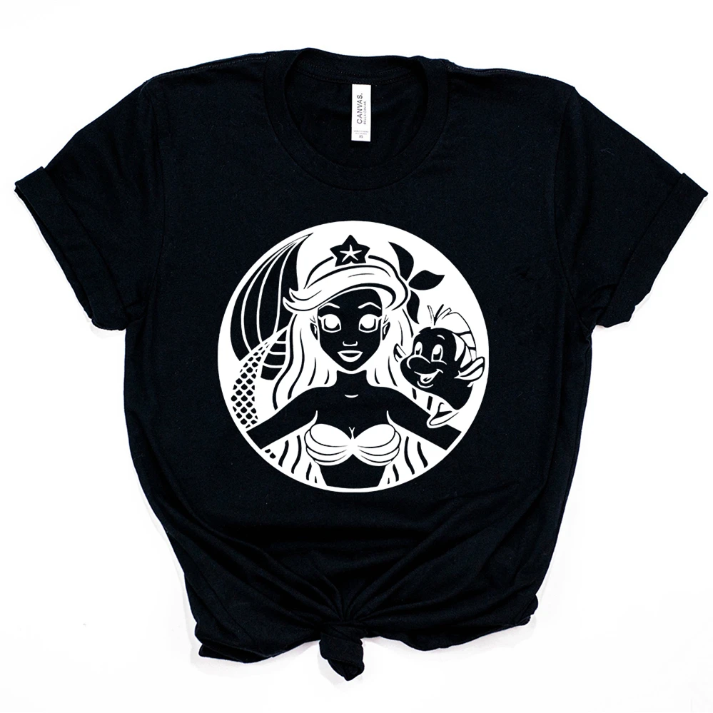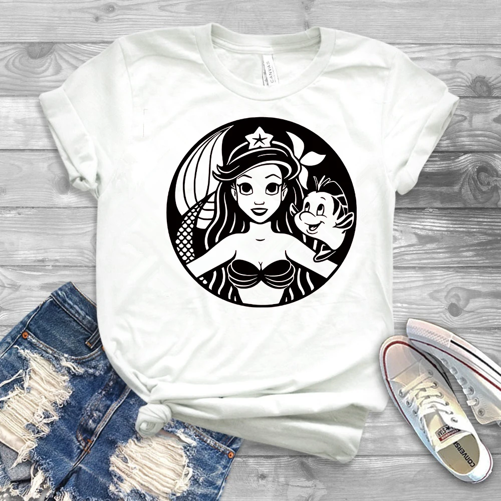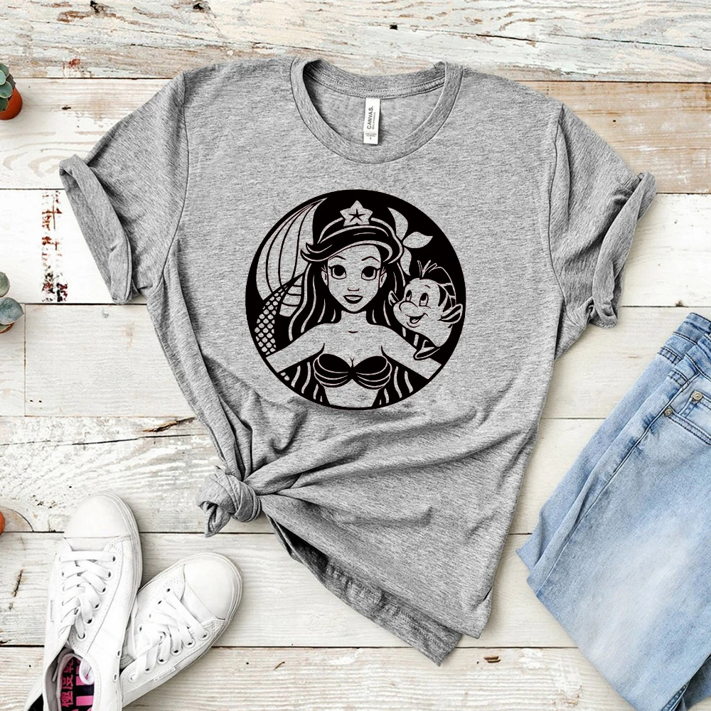 Футболка с изображением маленькой Русалочки, милая футболка с изображением девушек и цветочного рисунка, с изображением бункера и волос, не ухаживает за маленькими искусственными волосами