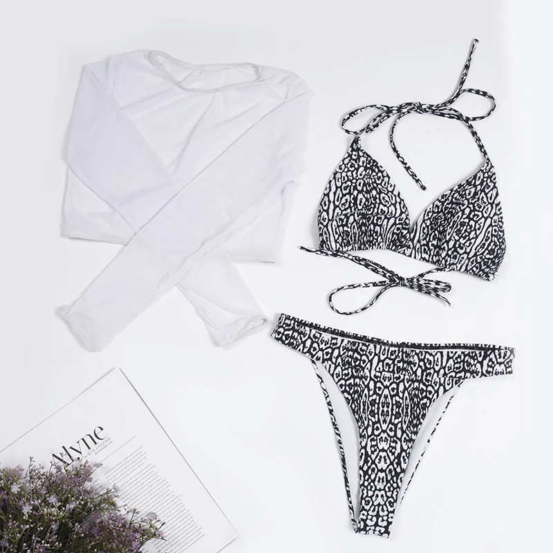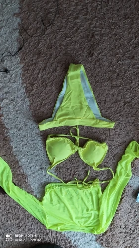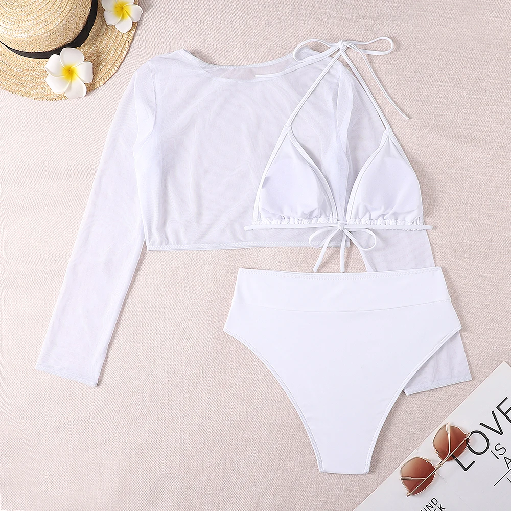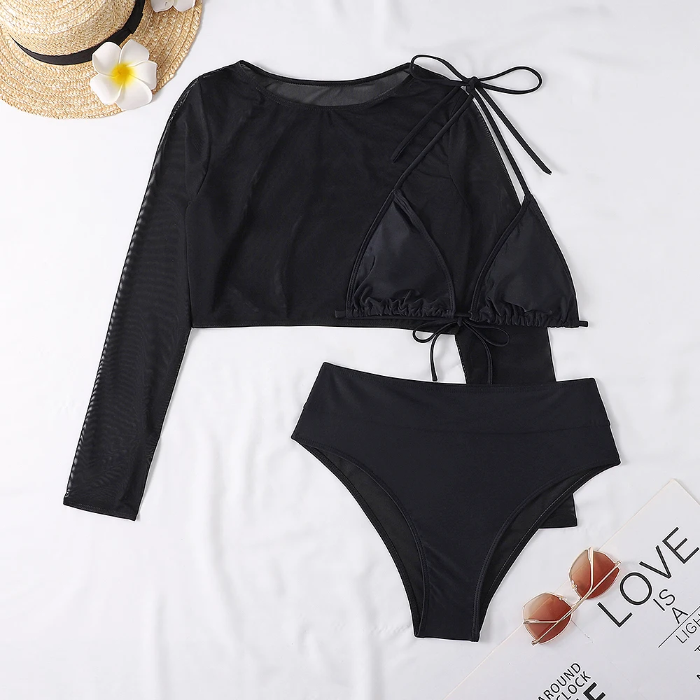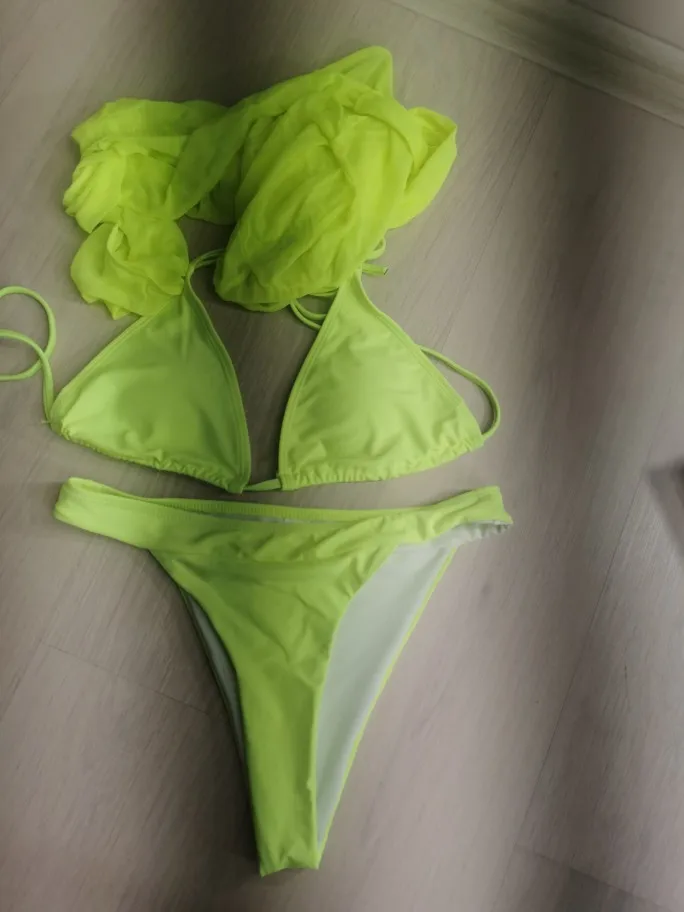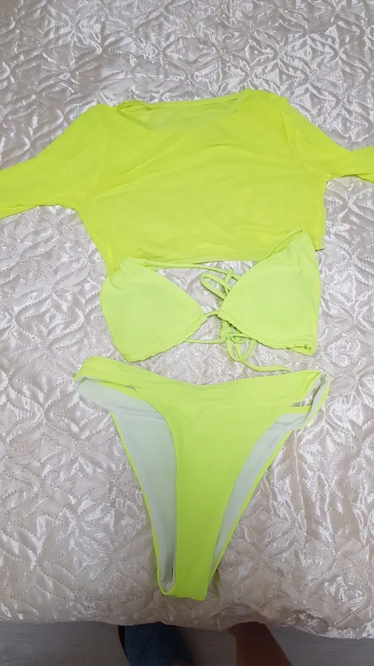 Женский неоновый купальник, пляжная одежда из трех предметов, сетчатая накидка с длинным рукавом, комплект бикини, лето 2020, желтый короткий топ