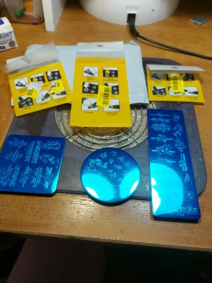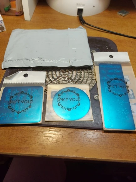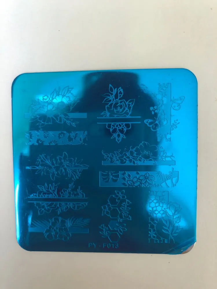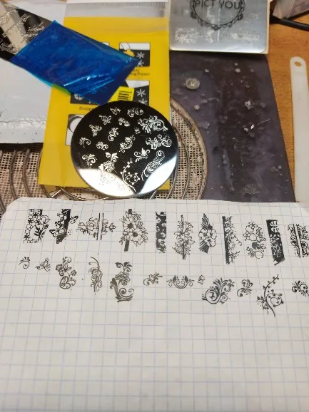 Доставка супер быстрая! За 2,5 недели! Пластина хорошая. Можно поэкспериментировать с цветами. Размер рисунков по мне, так чуток узковат, на крупные (широкие) ногти будет мал. Ну и гравировка слишком глубокая, нужно приноровиться, иметь мягкий скребок чтоб убирать поболее лака. Может с г.краской заработает по другому. Дизайн пробный, на уже отросший маникюр