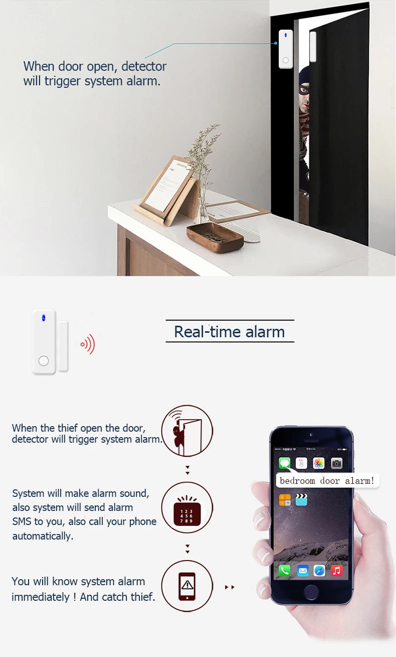 Это детектор открытия двери и окна. В режиме защиты, когда кто-то открывает окно или дверь, этот детектор запускает сигнал тревоги вашей системы. И вы получите сообщение приложения с будильником + звонок с будильником + SMS с будильником.