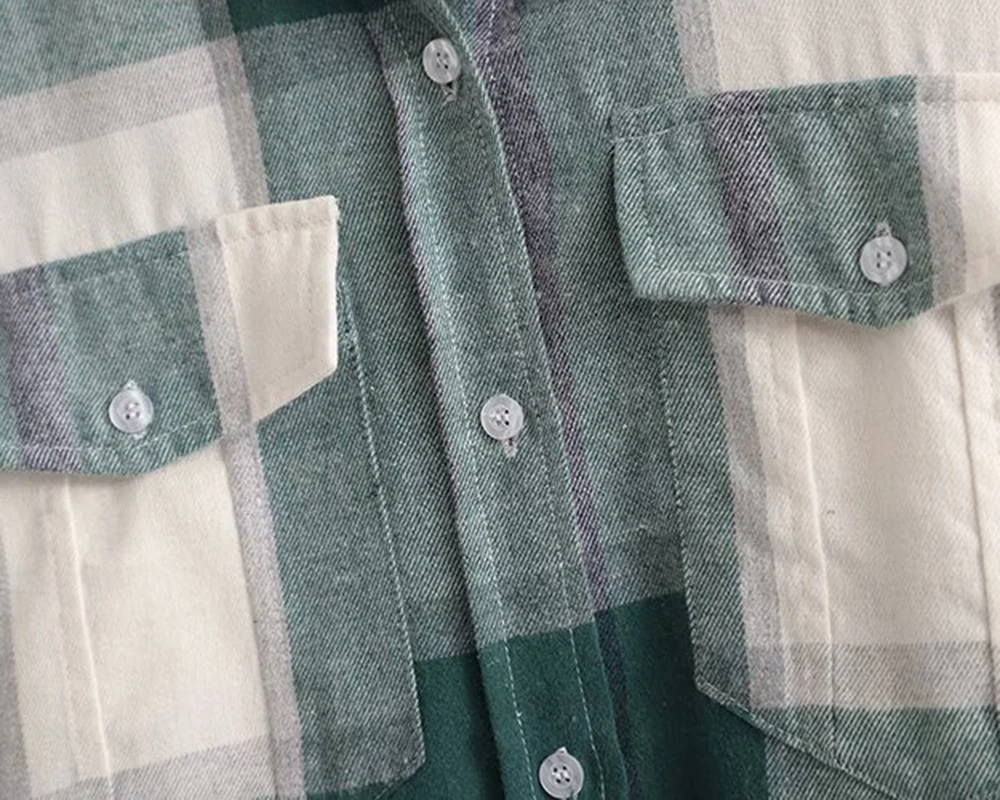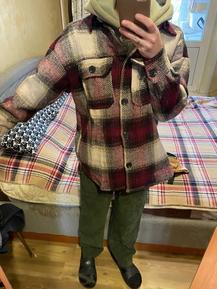 Рубашка не очень теплая, по качеству средняя, не было одной пуговицы на кармане, кое где торчали нитки, был неприятный запах. Сидит нормально, оверсайз.