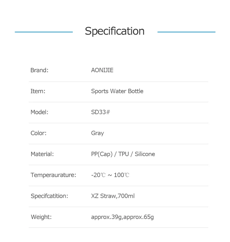 Спецификация: Бренд: AONIJIE Товар: Спортивная бутылка для воды Модель: SD33 # Цвет: серый Материал: ПП (крышка)/ТПУ/силикон Температура: -20 ℃ ~ 100 ℃ Спецификация: трубочка XZ, 700 мл Вес: прибл. 39 г, прибл. 65 г