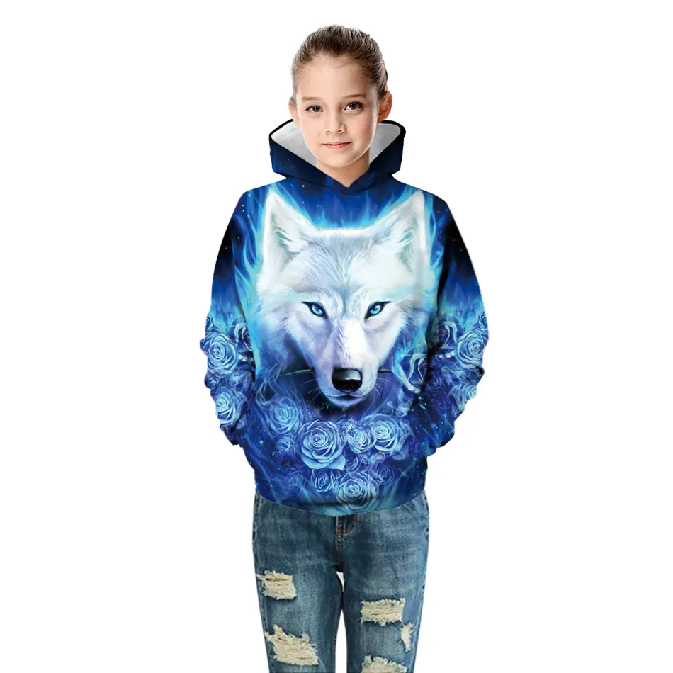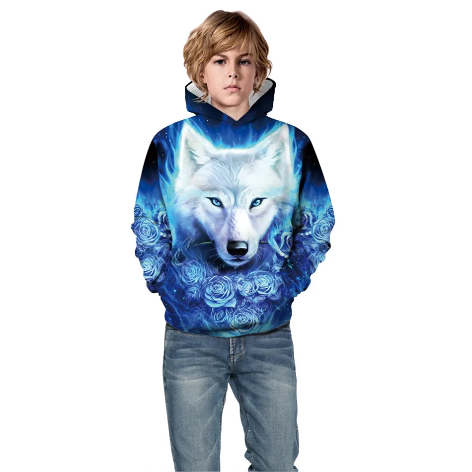 Толстовки с капюшоном для мальчиков и девочек, толстовки с 3D-принтом в виде синих роз, огненных черепов, волков и галактик