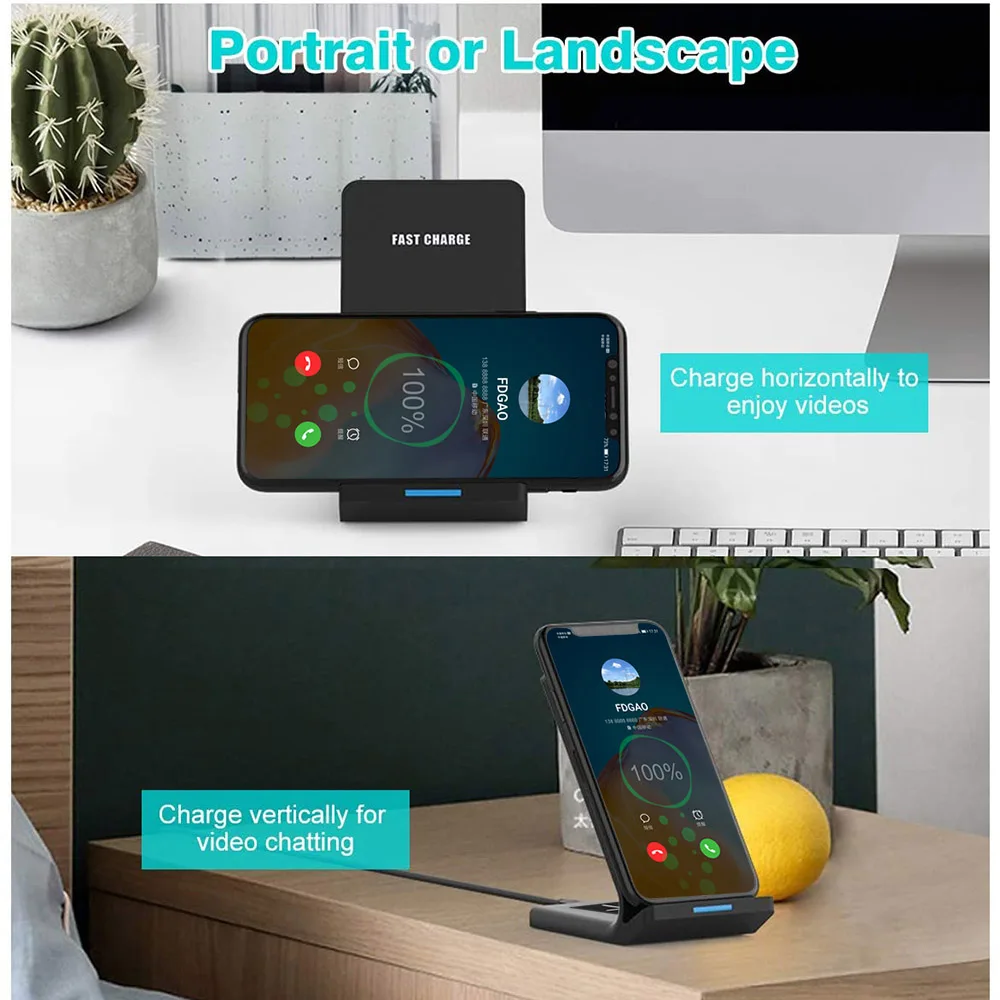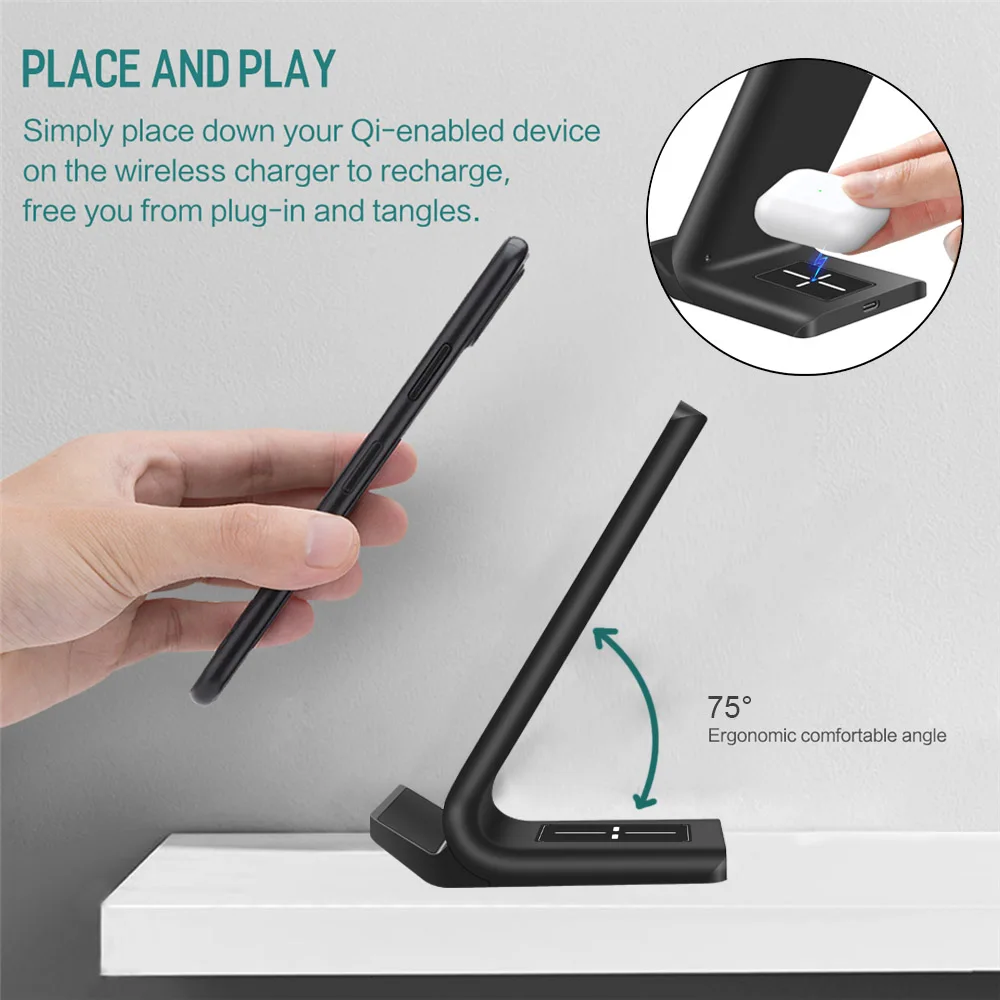 С противоскользящим материалом на нижней части беспроводного зарядного устройства и подставки, эффективно предотвращая смещение подставки и мобильный телефон, противоскользящий.