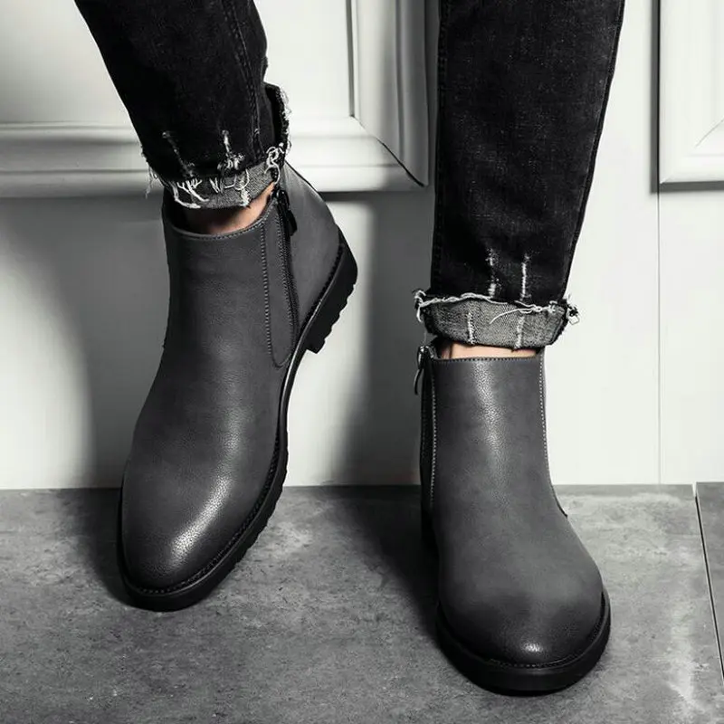 Модные тонкие простые мужские кожаные ботинки на молнии серые черны...