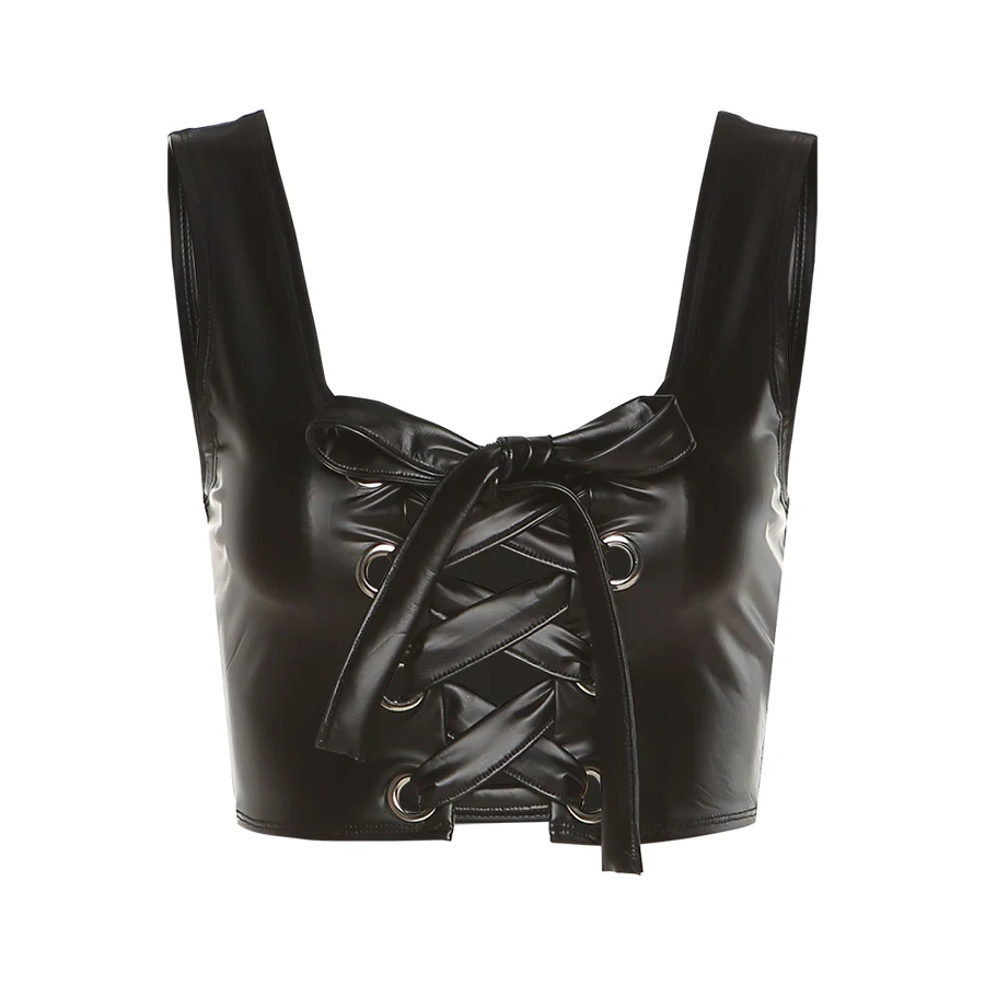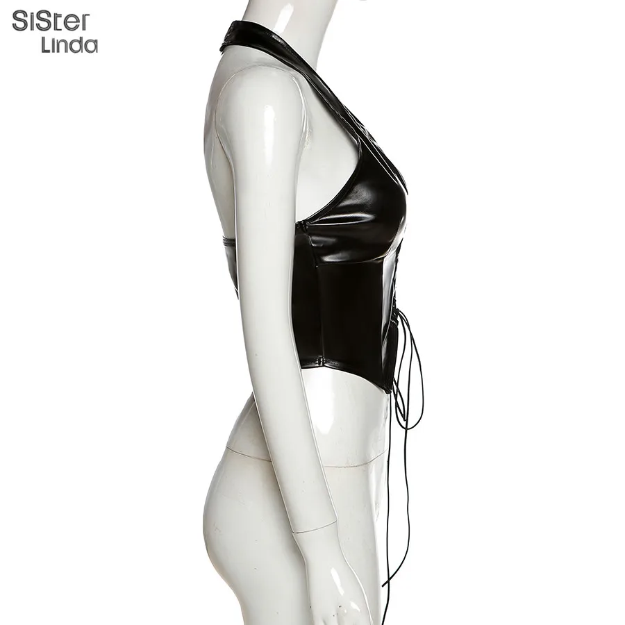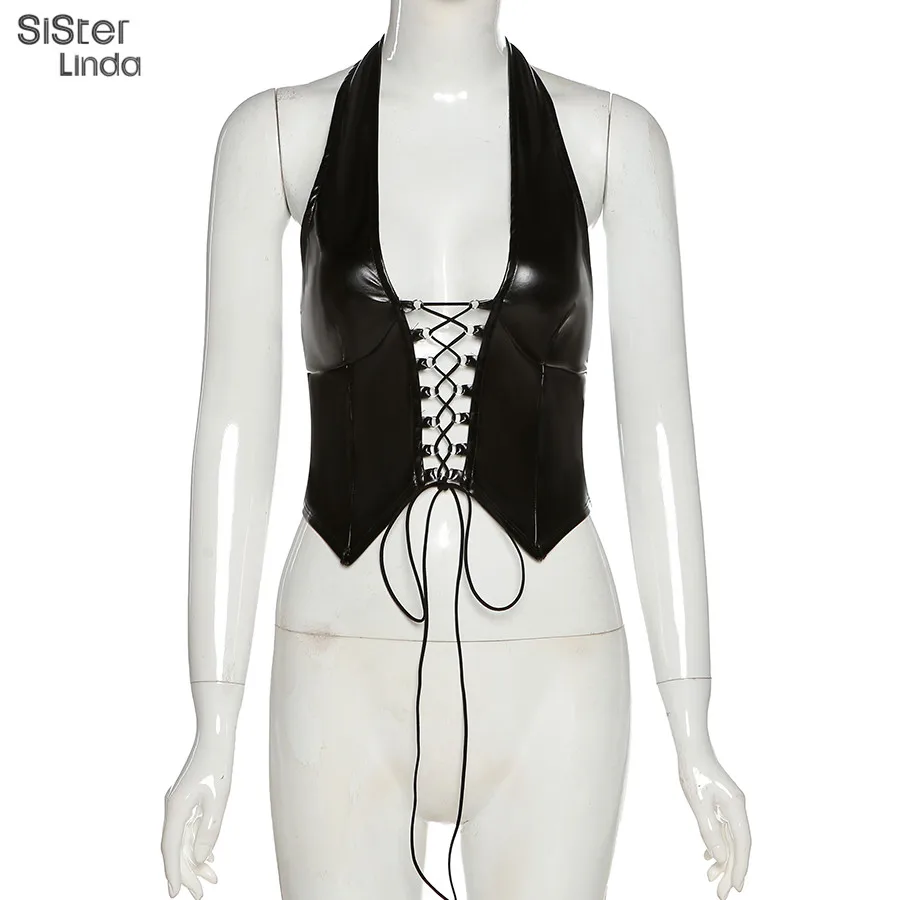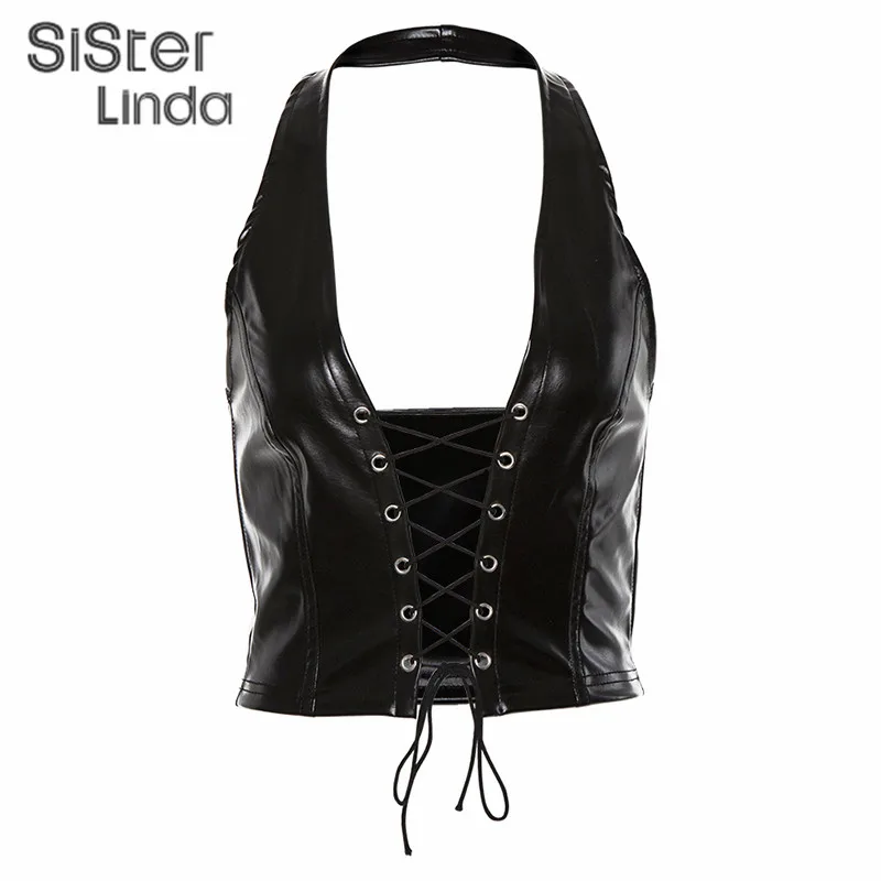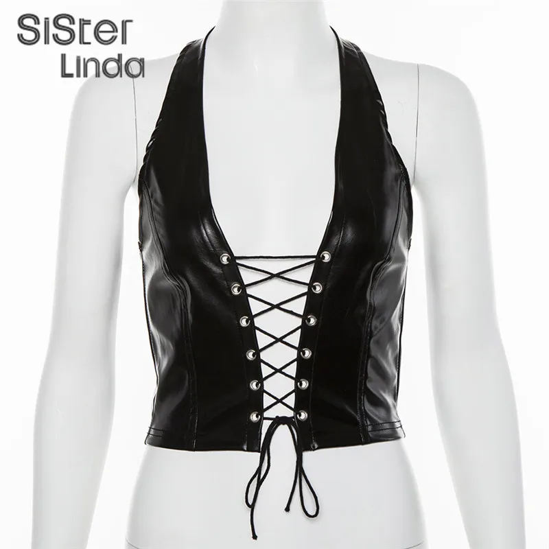 Топ женский из искусственной кожи, без рукавов, с глубоким V-образным вырезом и открытой спиной