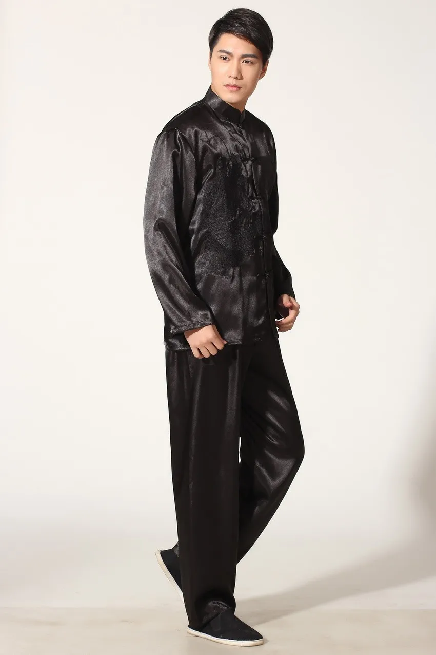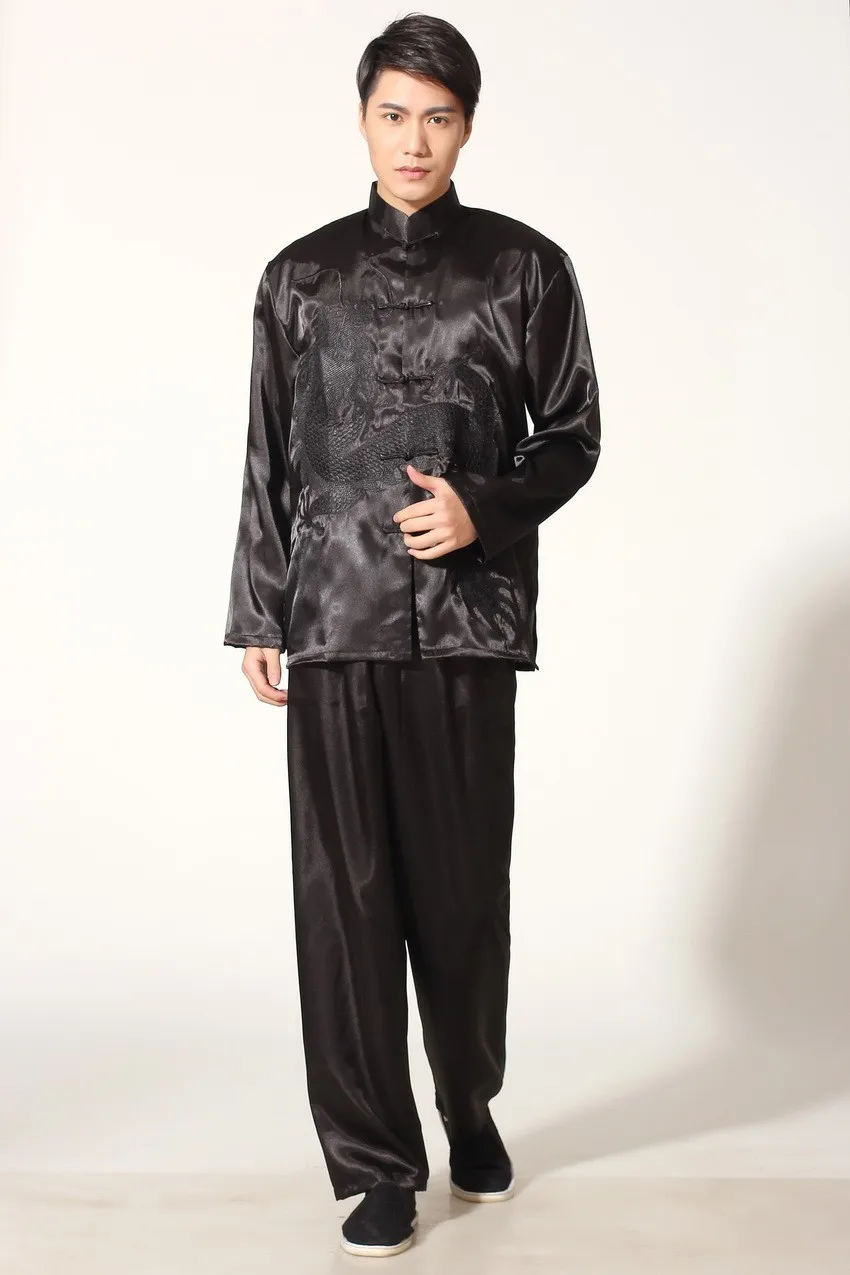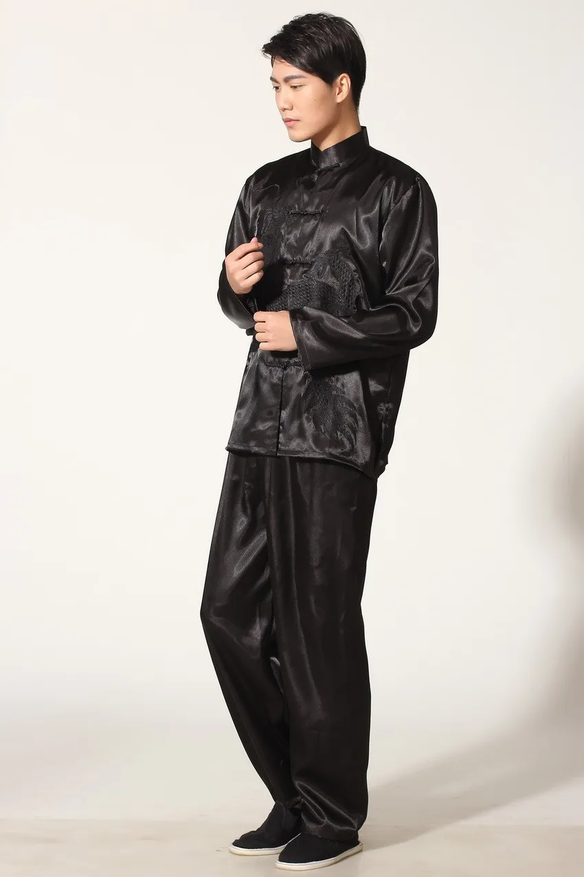 Костюм кунг-фу в традиционном китайском стиле, черный атласный костюм в винтажном стиле с вышивкой дракона Тай Чи ушу, Униформа, одежда S M L XL XXL