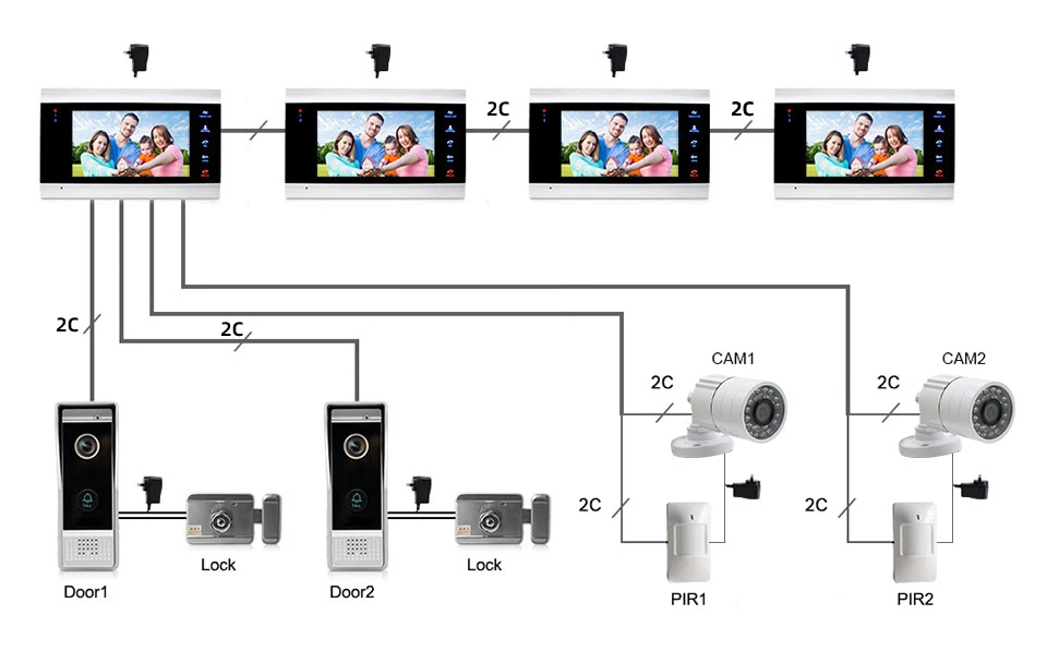 2 панели вызова + 4 внутренних монитора + 2 аналоговых камеры и 2 PIR