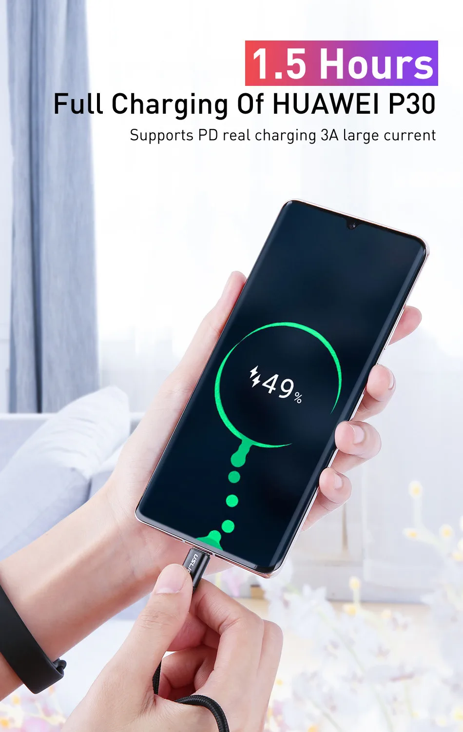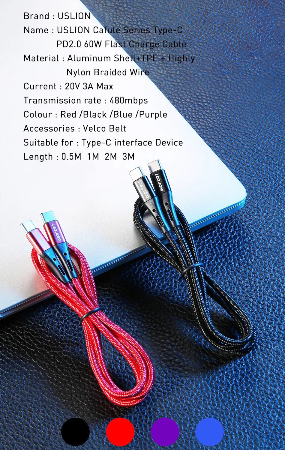 Кабель USLION USB Type-CType-C для Macbook, Samsung S10, S9, PD, 60 Вт, QC3.0, USB-C, 2 м, 3 м