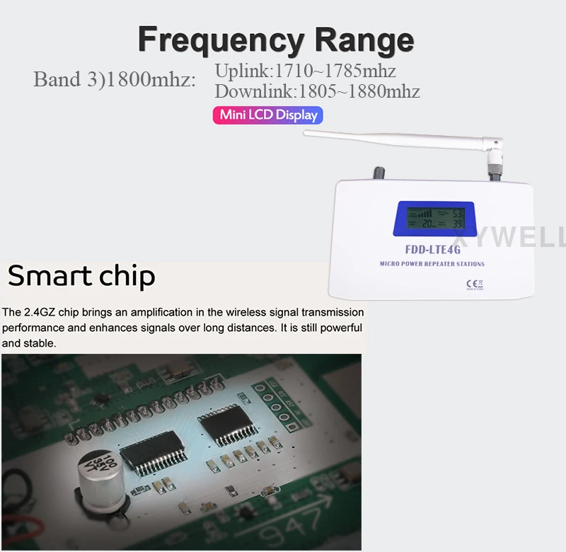 Идеально подходит для 1 - 2 комнат или небольших офисов: Попрощайтесь с удаленными звонками в вашем доме. 1. Работает для DCS. Ретранслятор сигнала LTE 1800 МГц. 2. Диапазон частот: восходящий сигнал: 1710 ~ 1785 МГц нисходящее Соединение: 1805 ~ 1880 МГц 3. С ЖК-дисплеем, может указывать состояние сигнала. 4. Площадь покрытия: около 300 кв. М без покрытия 1. Крышка антенны около 100-150кв. М. 5. Высокая линейная конструкция, ALC технология. 6,1 набор с 2G 3G 4G Наружной антенной, 2G 3G 4G внутренней антенной, Репитер сигнала. Идеально подходит для домашнего использования. 7. Улучшите внутренний мобильный сигнал, больше не снижайте звонки, больше нет плохой скорости сети.