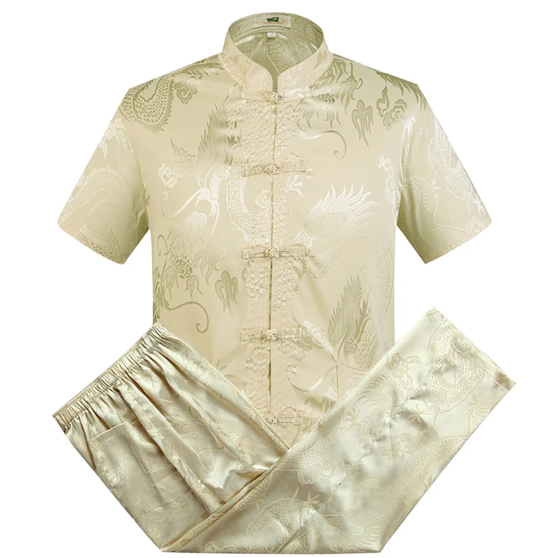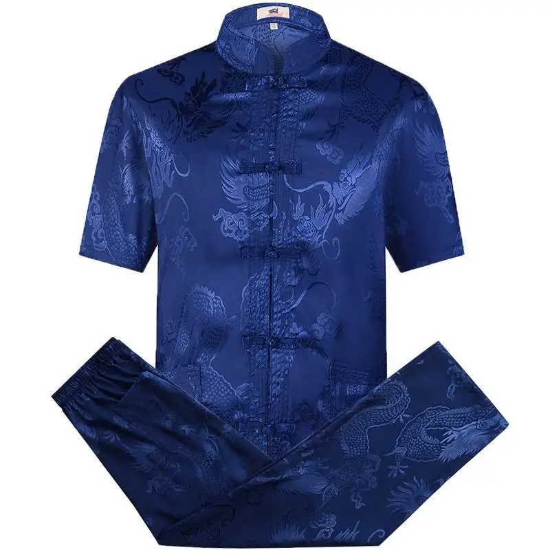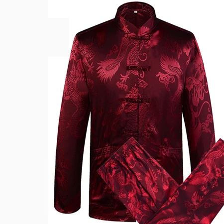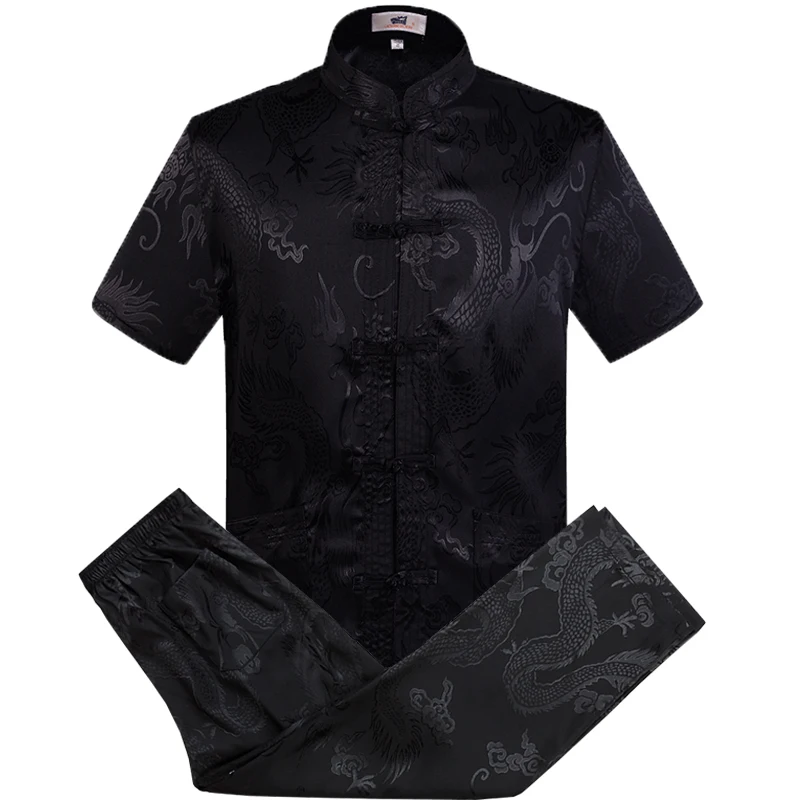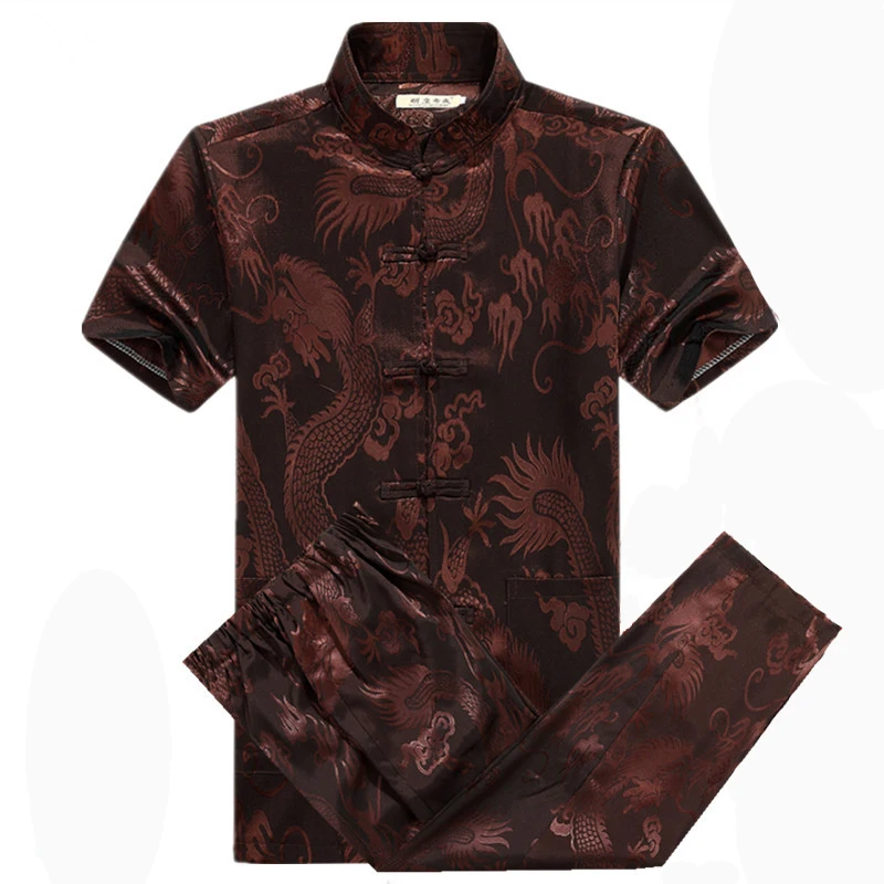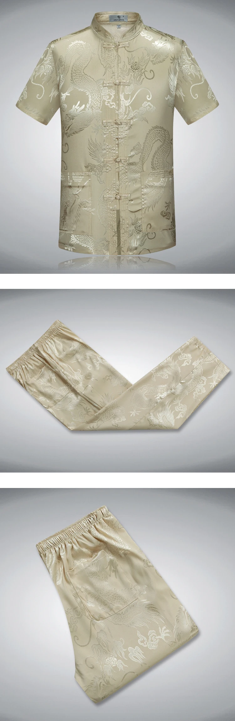 Красный Новый китайский традиционный мужской костюм Тан, комплекты с коротким рукавом и длинными брюками, костюм кунг-фу, высококачественные шелковые комплекты Wu Shu Tai Chi