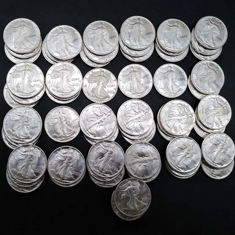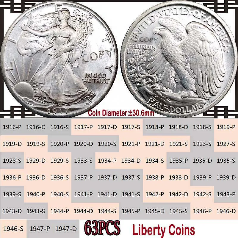 63 шт., копия монет США, полный комплект, ходячие монеты за полдоллара свободы, коллекционные монеты 1916-1947