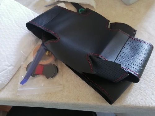 Сшитый вручную черный чехол рулевого колеса автомобиля из искусстве...