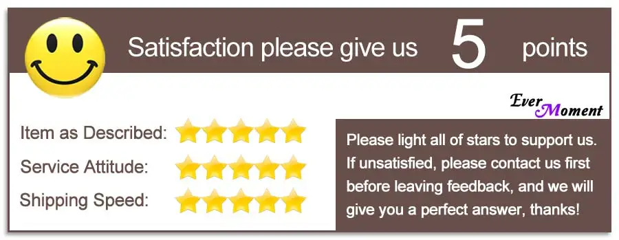 * Положительные отзывы будут даны каждому покупателю после оплаты. Надеюсь, вы сделаете то же самое со мной. Если вы удовлетворены нашим продуктом и обслуживанием, пожалуйста, оставьте нам пять звезд отзывы, которые могут порекомендовать нам предоставить лучший сервис и товары. * Если вы не удовлетворены по каким-либо причинам, пожалуйста, не спешите оставлять низкий DSR (менее пяти звезд) или нейтральный/отрицательный отзывы. Просто свяжитесь с нами для решения в любое время. Мы сделаем все возможное, чтобы предоставить вам лучшее решение как можно скорее.