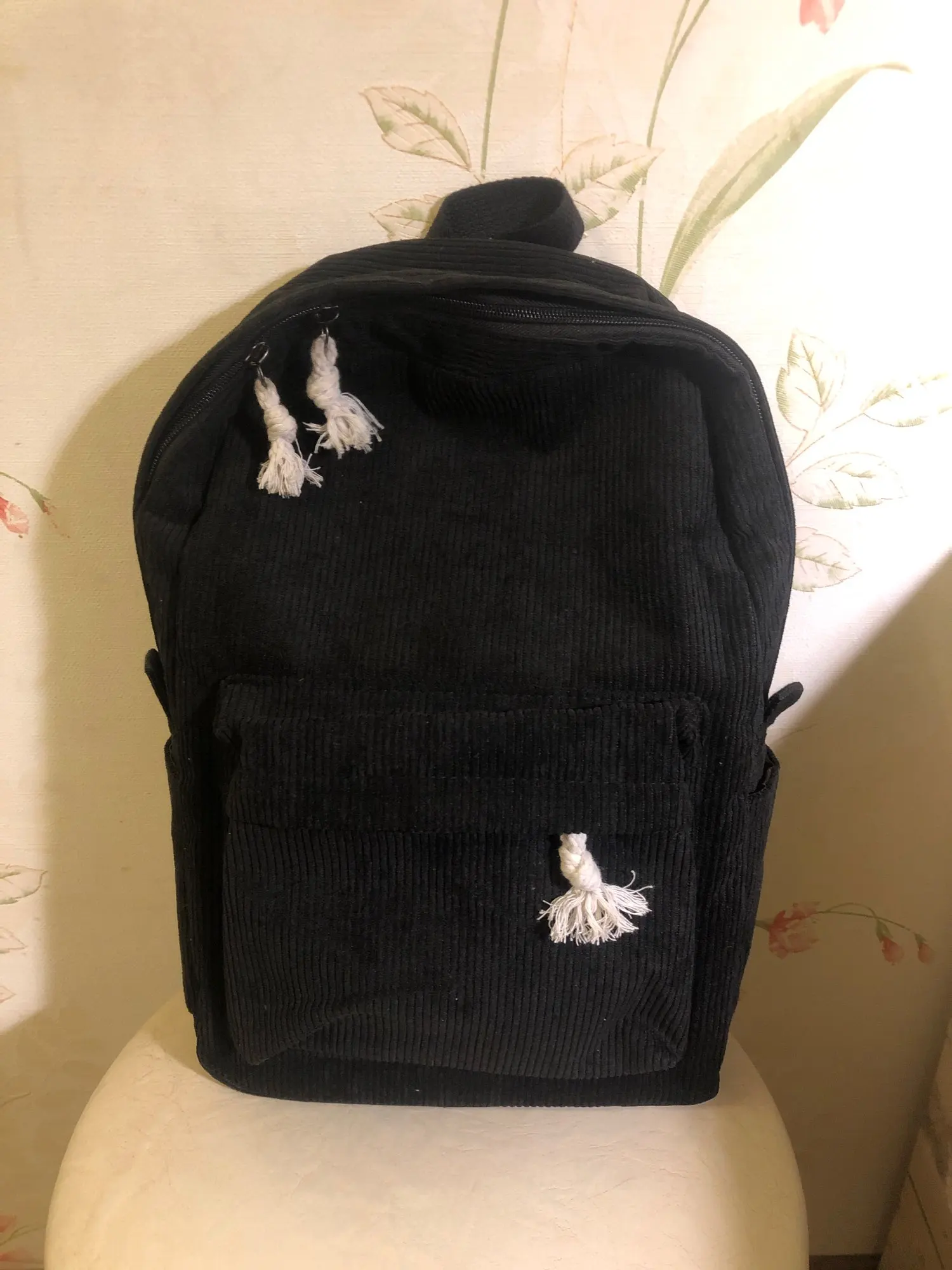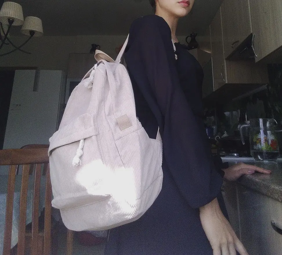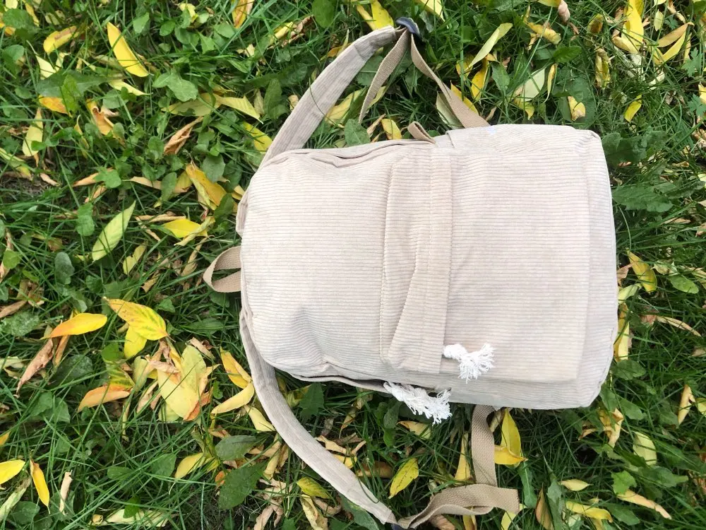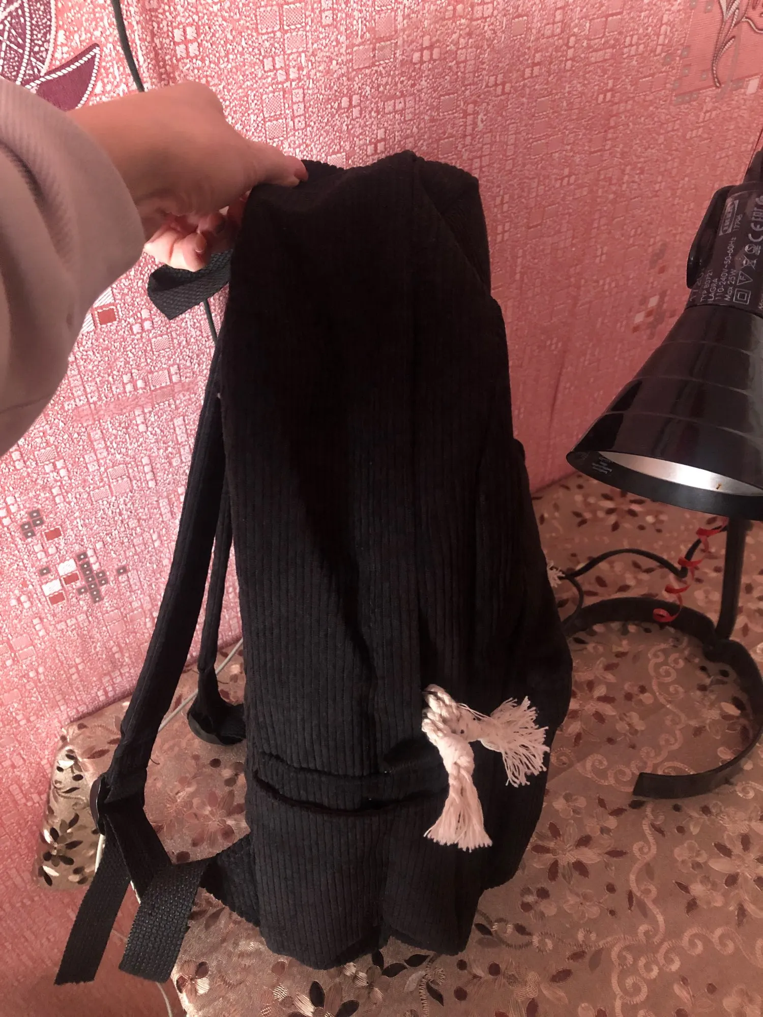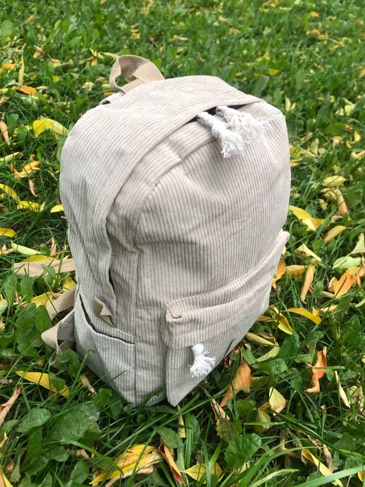 Плотная ткань,вельвет.Довольно вместительный рюкзак