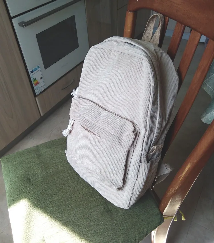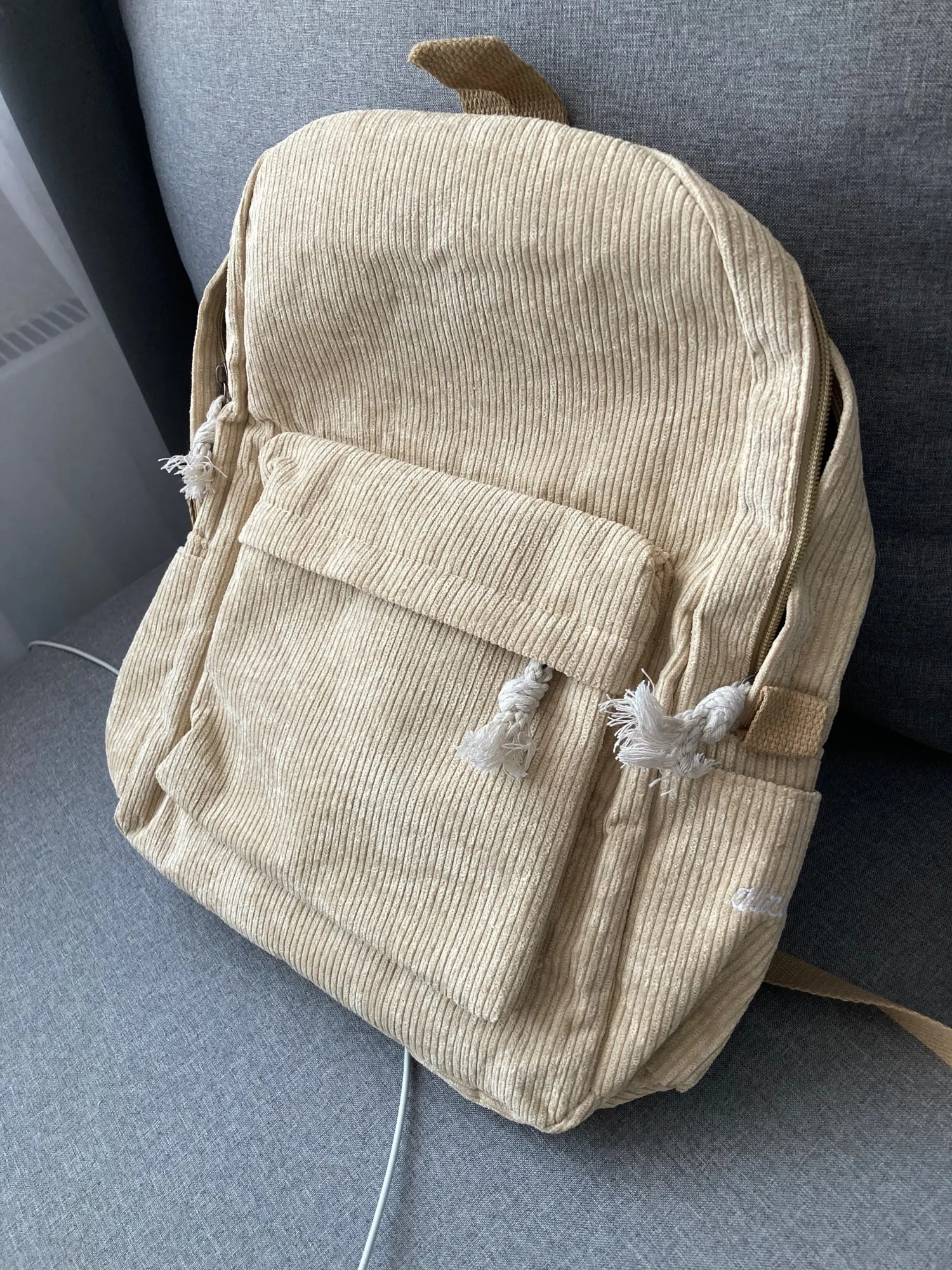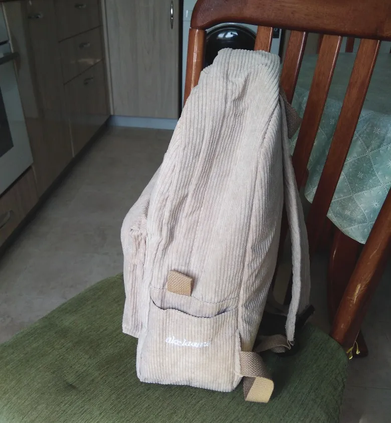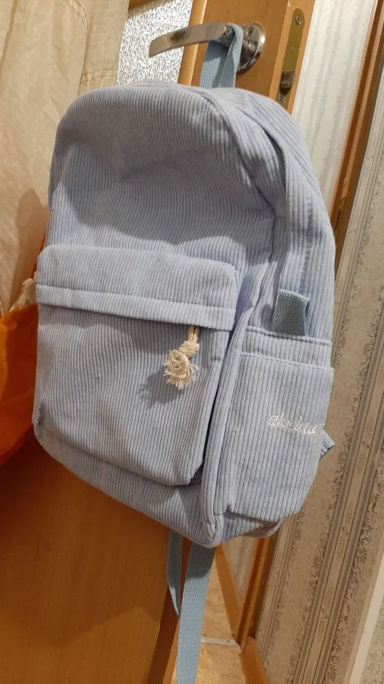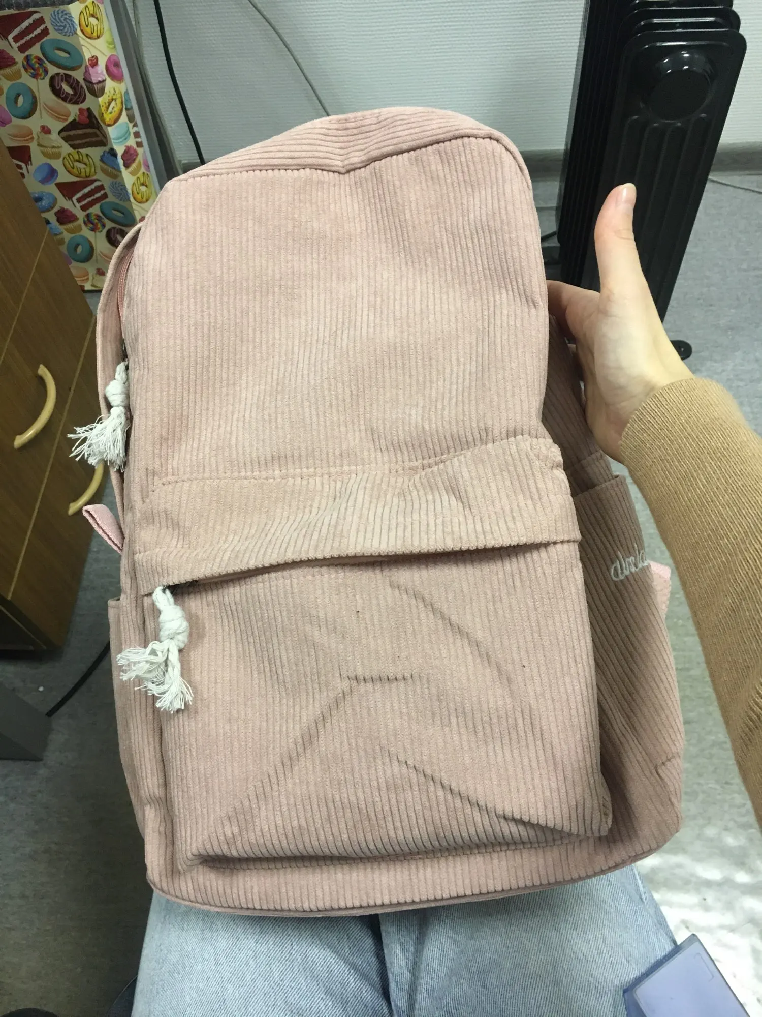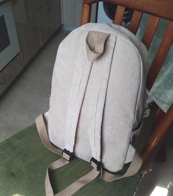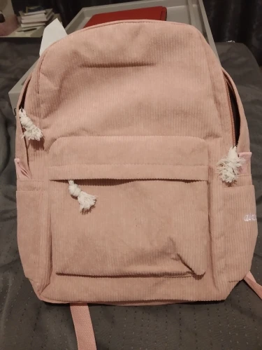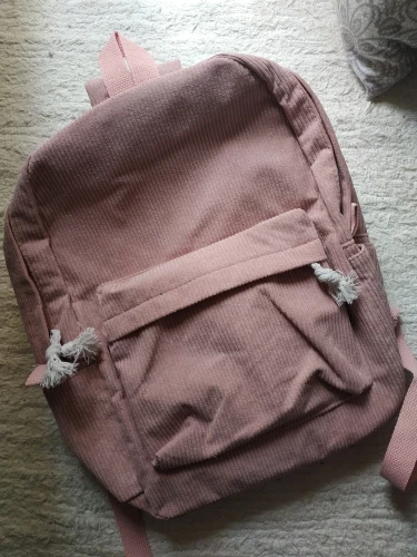 i got the gray one, and it looks exactly as shown in the photos. the zippers do not get caught and aren't hard to pull on, the straps are also adjustable and secure. this is a very roomy backpack, you can put tons of stuff in here. the corduroy material of the backpack is thin, and overall the backpack is pretty light and may be fragile, so if you want this to last make sure you aren't too rough with it. inside, theres a little sleeve like in kanken backpacks, to put a folder or maybe a laptop in? only minor issue was the smell after unpackaging the backpack, but it will go away if you spray it with a fabric refreshner. overall its rlly cute and great for the price :3