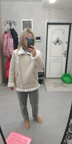 Классная дубленка. До Мурманской обл за 2 недели долетела) забрала в ПВЗ. Переживала, что ремень будет сильно отличаться от куртки, а нет, этого незаметно. Видимо фото так передаёт. Куртка супер тёплая. Мехе лезет, но пройдя валиком все стало ок. Куртка НЕ маломерит. На свой М я заказала Л, и пришла реально Л, плечи то на месте, а вот все остальное «оверсайз» .Но, поносив 2 дня я все-таки нашла минусы:1) из-за того, что рукава слишком широкие, туда задувает ветер и руки мерзнут. 2)в ней не удобно ездить за рулём, у меня еле как крутятся руки. 3) она супер тёплая, но зайдя на минуту в аптеку, я вспотела моментально , потом шла домой вся сырая. 4) примеряла на футболку и огромные швы в рукавах очень сильно натирали. Не знаю, может мне такая досталась, но на кофту все норм. 5) не скажу, что она лёгкая (про вес), она реально громоздкая и тяжелая. А так я довольна