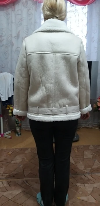 Мега доставка!!! В Омск за 10 дней! У меня шок Авиатор хороший, по размеру попала. На объёмы 95-75-95 XL хорошо, есть свободное место под тёплую кофту. Рукав с подворотом - до пальцев, на фото видно. Цвет не полнит. Горловина застегивается прекрасно. Меня смутили швы... Интересно, это так и должно быть? На фото видно. Что не понравилось, так это то, что нижний ремень из кожзама, а сама куртка - не понимаю из чего. Это бросается в глаза на мой взгляд. Тонкая, не на зиму. До - 5, -7. В целом покупкой довольна.