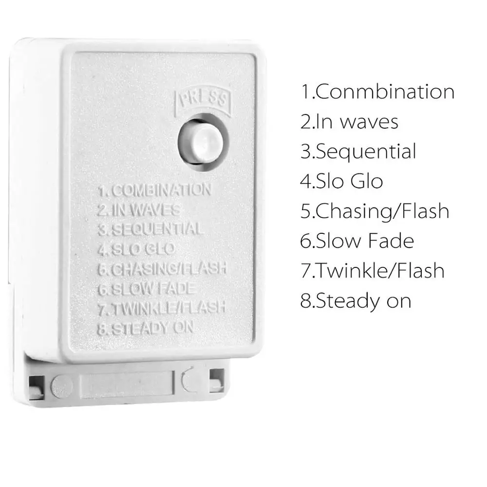 8 режимов: комбинация, в волнах, последовательных, Slo-glo, чеканка/вспышка, медленное выцветание, мерцание/вспышка, и устойчивый на. Светящиеся гирлянды обеспечивают красивое мягкое свечение, которое можно установить в любой из восьми различных конфигураций эффектов. Хотите ли вы, чтобы они постоянно горели, или хотите, чтобы они медленно тускнели, мерцали или были последовательны, эти огни готовы дать вам много различных вариантов. С помощью одной кнопки переключения режимов вы можете наслаждаться красивыми полосками света.