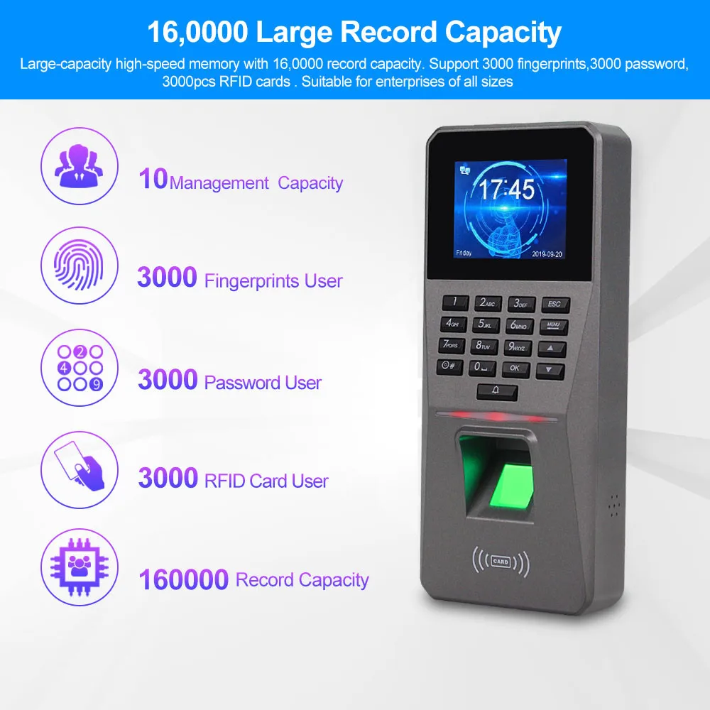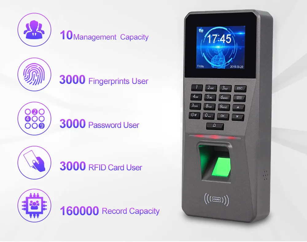 Устройство контроля доступа по отпечаткам пальцев является простым и простым в использовании устройством контроля доступа по отпечаткам пальцев, которое может быть установлено в чувствительных областях, требующих авторизации для входа, И творчески сочетает в себе Распознавание отпечатков пальцев высокой безопасности с передовым управлением доступом для достижения доступа. Высокий уровень безопасности управления. С этим рекордером времени отпечатков пальцев, вы можете иметь ваш персонал проверить с помощью отпечатков пальцев, RFID карты и пароль. Поддержка 3000 пользовательских возможностей, 3000 отпечатков пальцев, 3000 паролей, 3000 rfid-карт, 10 administrator, 160000 емкость записи. Между тем он имеет TCP/IP/RS485 и USB способы связи, устройство может быть использовано в сетях. Вы также можете получить информацию из него, что вы получаете из листа excel, что делает его ясным для вас Смотрите и анализируйте. Широко используется в входах и выходах офиса, фабрики, отеля, школы и т. Д. Полезное и удобное устройство для проверки посещаемости вашего персонала.
