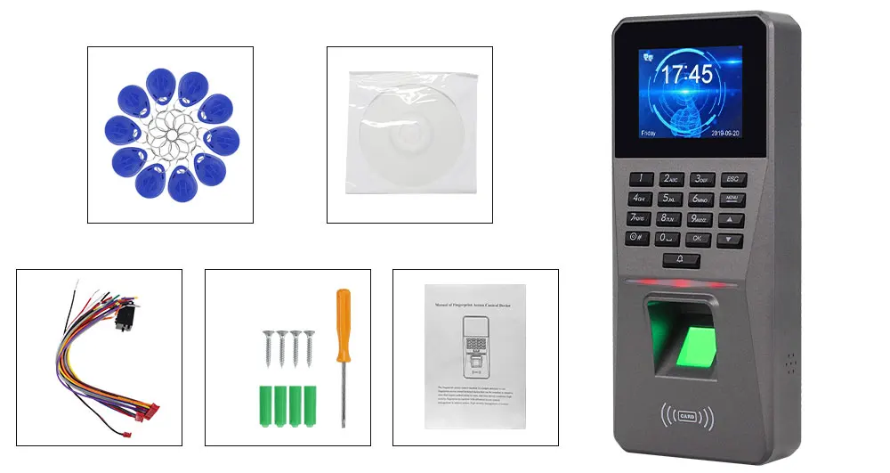 1 машина контроля доступа по отпечаткам пальцев CD-диск с программным обеспечением-1 шт. 4 x Кабель 1 х пакет винтов 1 x Руководство пользователя 10 брелков RFID