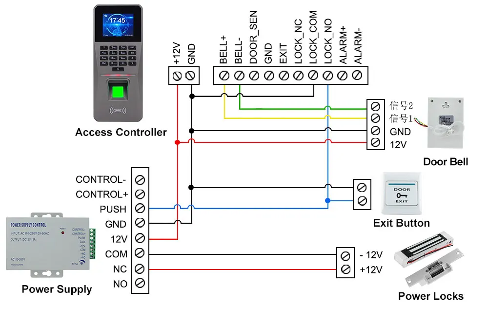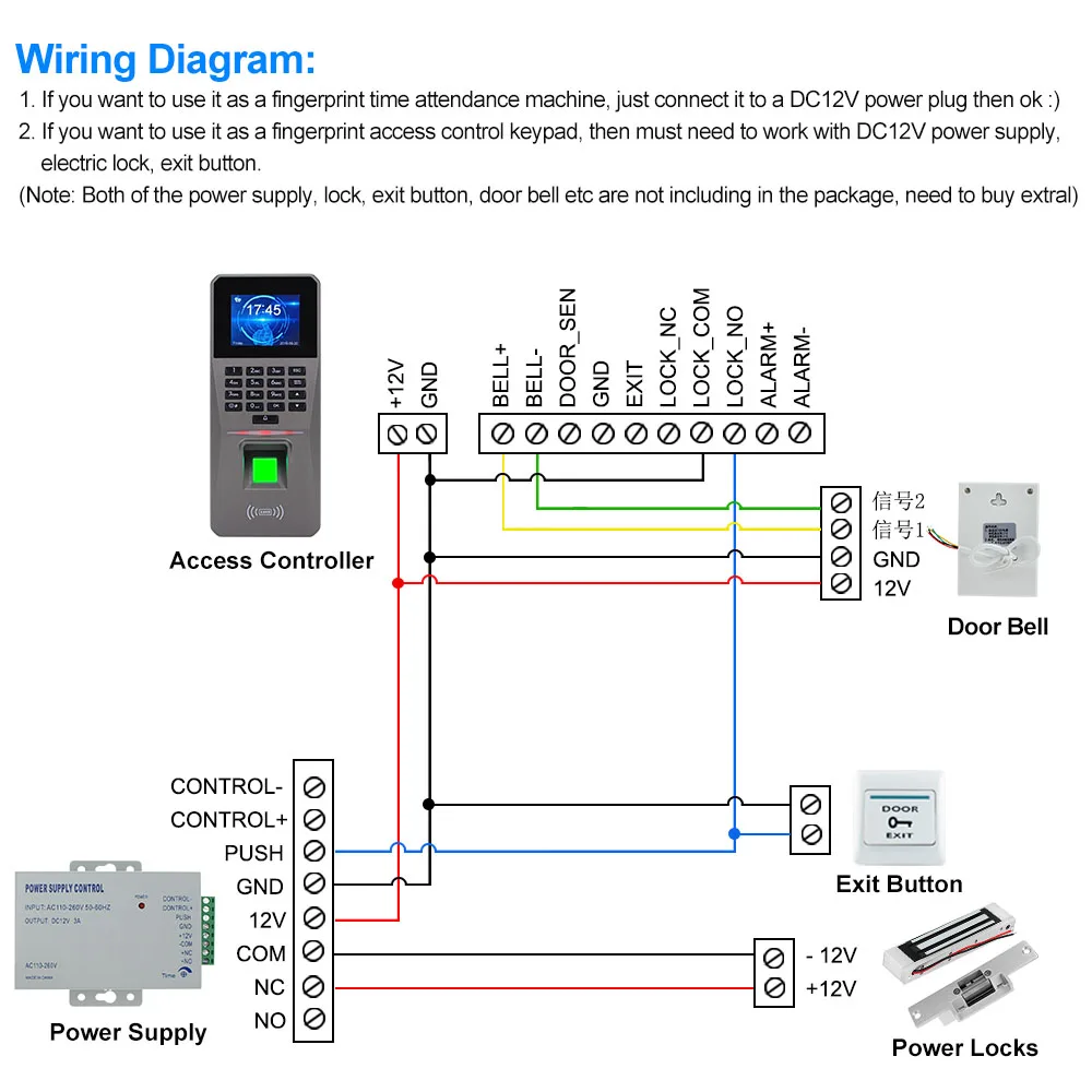 1. Если вы хотите использовать его в качестве отпечатка пальца посещаемости времени, просто подключите его к вилке питания DC12V, а затем ОК :) 2. Если вы хотите использовать его в качестве клавиатуры контроля доступа по отпечаткам пальцев, то необходимо работать с источником питания DC12V, электрическим замком, кнопкой выхода. (Примечание: оба блока питания, замок, кнопка выхода, дверной звонок и т. Д. Не включены в посылка, нужно купить дополнительно.)