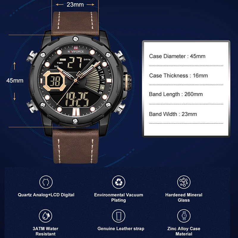 Часы наручные NAVIFORCE Мужские кварцевые, модные спортивные Водонепроницаемые светодиодные аналоговые цифровые, с кожаным ремешком