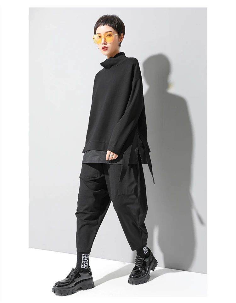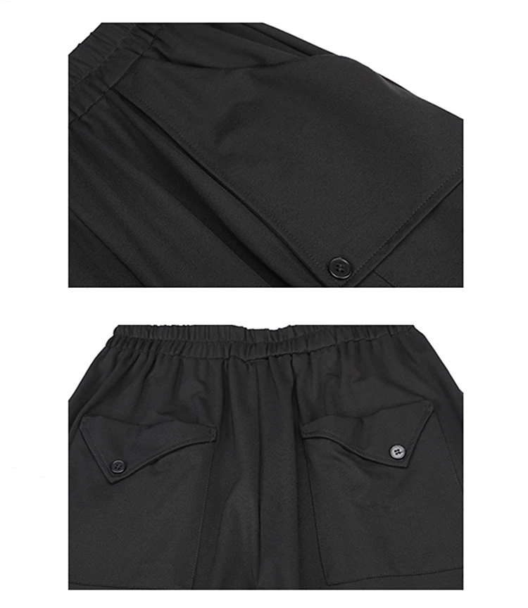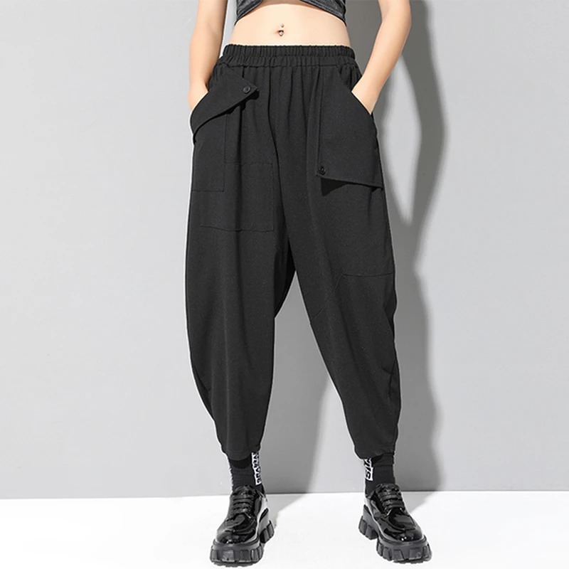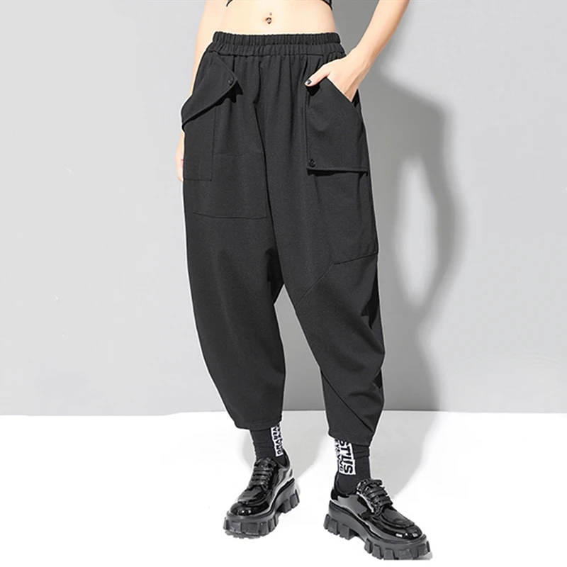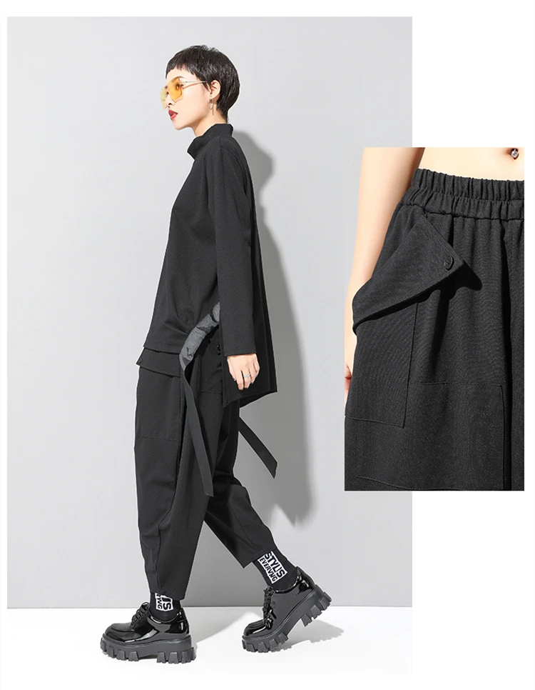 Брюки-султанки женские с завышенной талией, модные повседневные свободные штаны с эластичным поясом, со вставками и карманами, в Корейском стиле, черные, весна-осень 2021