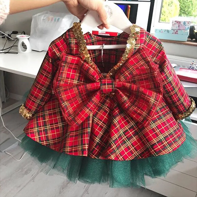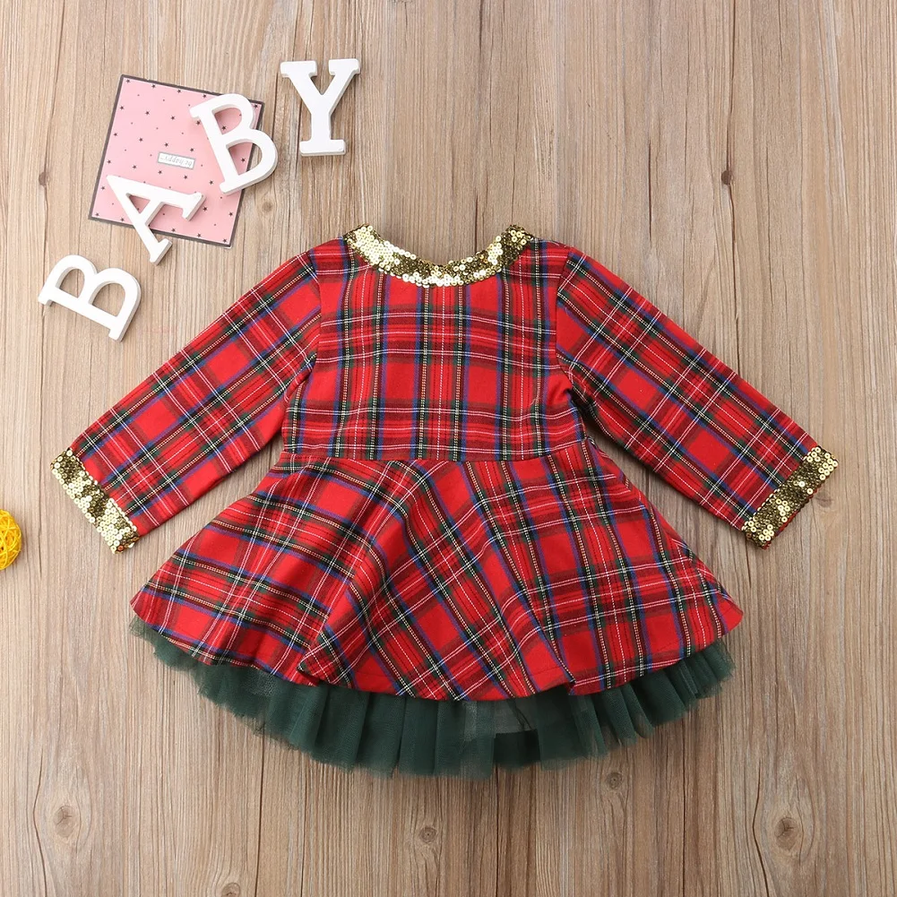 Рождественское милое праздничное платье для маленьких девочек от 1 до 6 лет, клетчатое ТРАПЕЦИЕВИДНОЕ красное платье с длинным рукавом и оборками, осенняя одежда