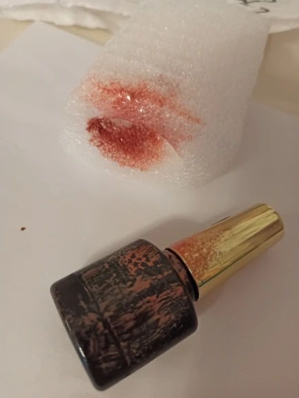 La couleur dans le flacon semble plus rouge que sur la photo. Je n’ai pas encore essayé le produit qui semble liquide.