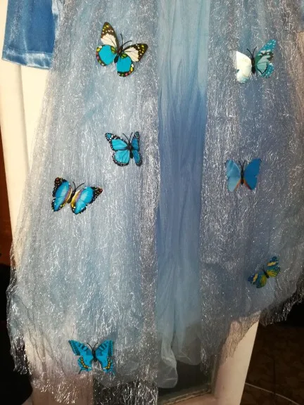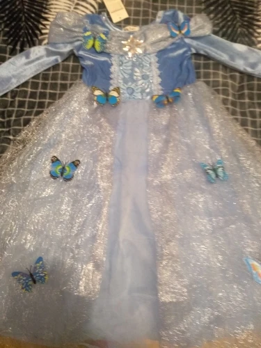 Платье конечно обалденное, в живую ещё лучше чем на картинке швы ровные, всё целое, снежинка прикреплена надёжно. Бабочки пластиковые на Булавочка, красивые. Доченька будет принцесса на НГ. До Продавца рекомендую, спасибо ему большое. На фото только с пакета, ещё не отпаренное. Пришло за 21 день до ДВ.