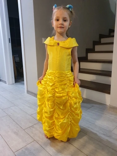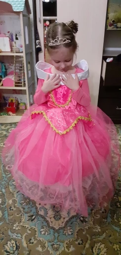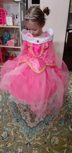 Платье огонь)))) очень крутое, нам понравилось. Дочка давно хотела платье Авроры. Маааленький минусик платье не прям в пол, поэтому если хотите длиннее, берите на 7 лет размер. Нам 4,5 года 110 рост, взяли 6 размер. Ну очень нравится. Спасибо.
