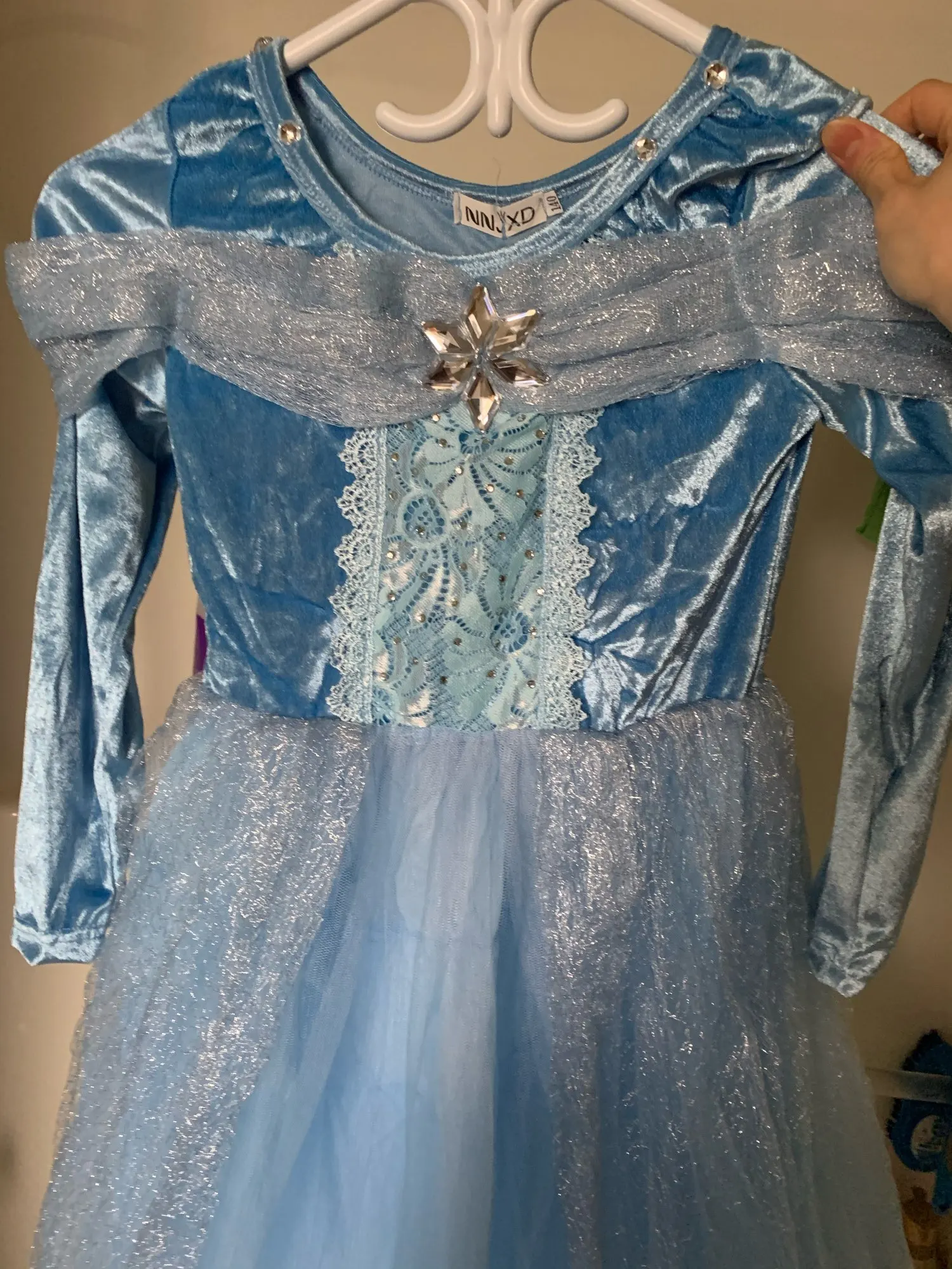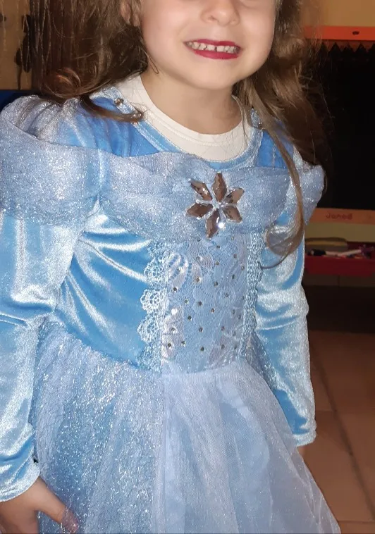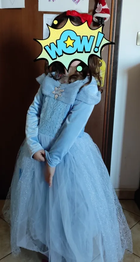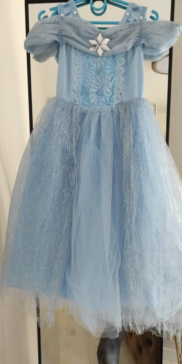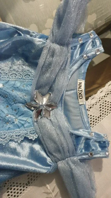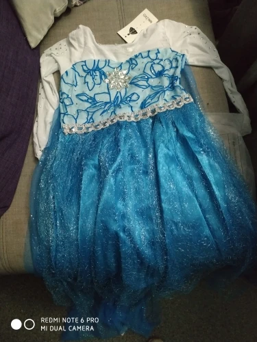 Это просто супер покупка! Настоящее счастье для девочки) Очень красивое, воздушное. Шибко за качеством не гналась, потому что все равно такие платья носят один, ну максимум два раза. Но все устроило, все ровненько, без брака, не пахнет. Снежинку на фото уже сами прицепили. Размер 110 на девочку 104 см и 17 кг прям тютелька в тютельку, шлейф сзади ровно в сантиметре от пола, так и хотела, потому что шлейф по полу, конечно красиво на фото, но на деле не удобно, ребёнку его точно оттопчут на празднике, да и упасть может. Если девочка не худая, берите с запасом, так как никаких замков на платье нет.