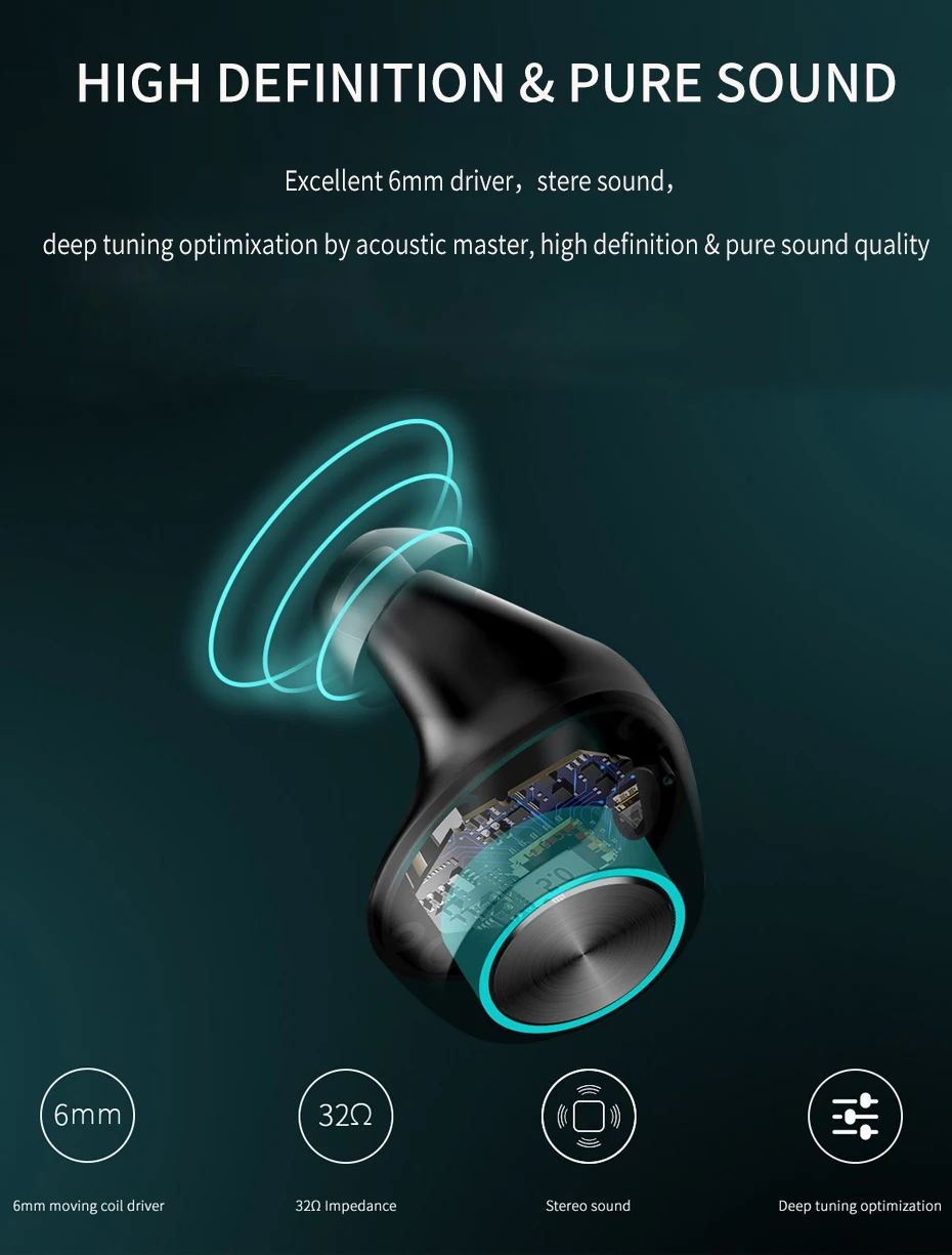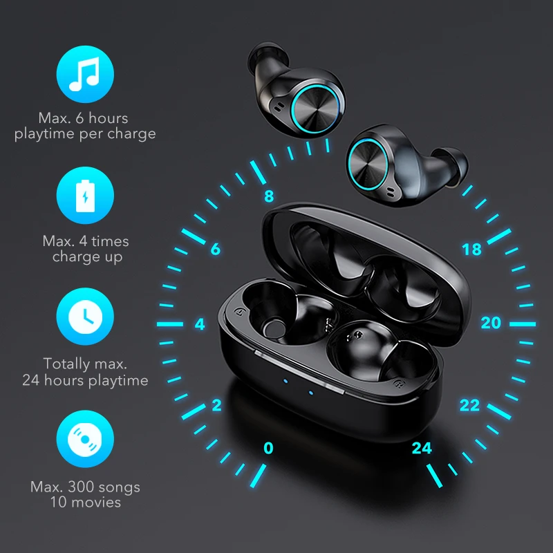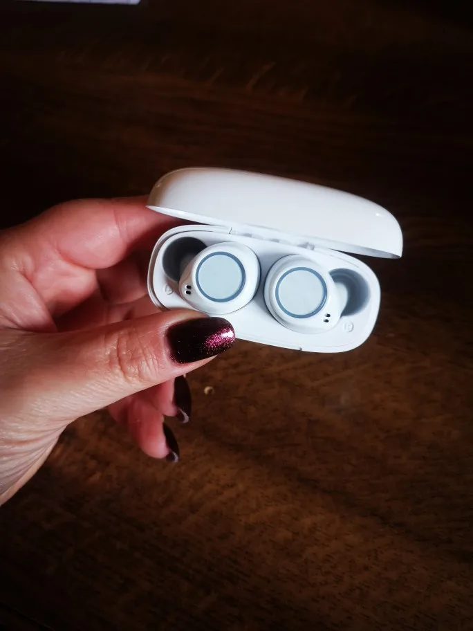 Заряд батареи держится долго. Заряжаются в футляре. Слышимость хорошая. Для музыки Hi-Fi маловато басов. Но такой размер и не сможет прокачать басы. Сопротивление маловато.