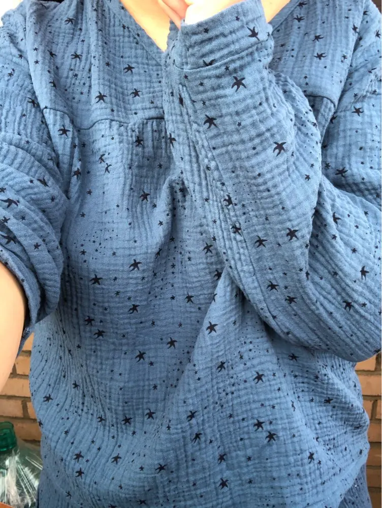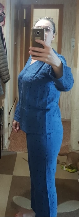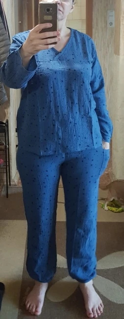 мягкая и приятная ткань. брала в качестве домашнего костюма. но придется доработать верх, т.к.очень свободная "распашонка" и рукава широкие. для сна вообще бы не заморачивалась. и вместо двух карманов как на картинке, на штанах один накладной карман