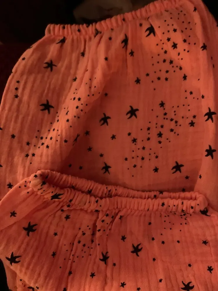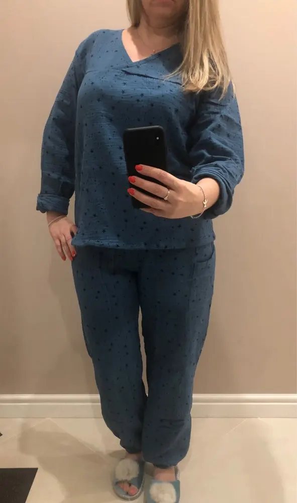 Приятный материал и мне очень понравился верх от пижамы) Немного не поняла что с размерами... у меня М-L, но тут я взяла XL и он в самый раз...