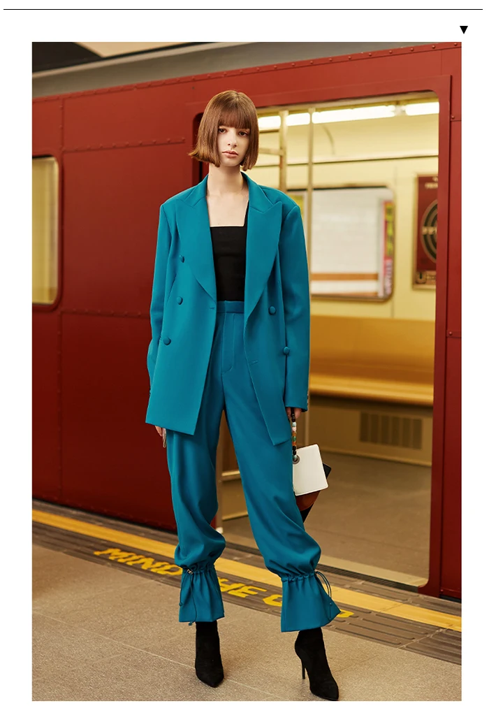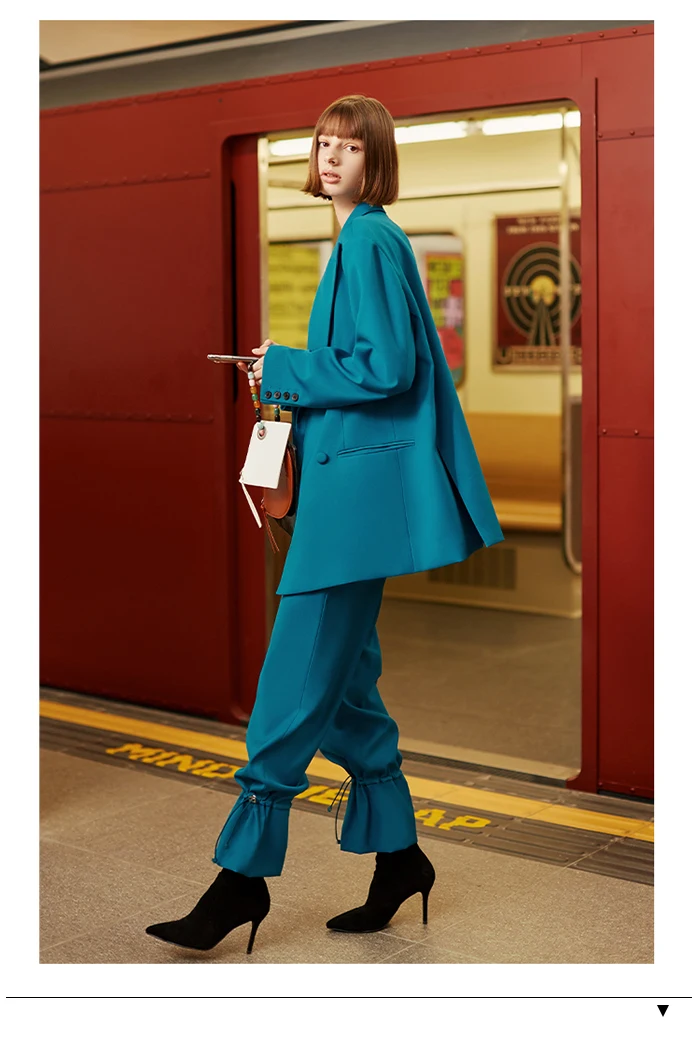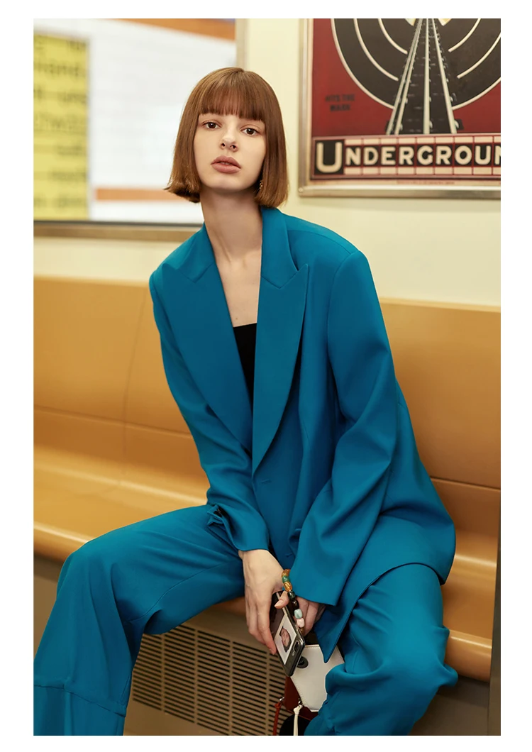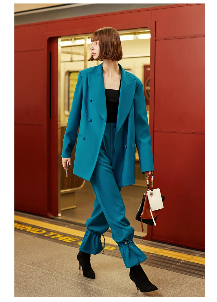 Осенне-зимний женский брючный костюм AEL в британском стиле, блейзер сине-зеленого цвета и широкие брюки в стиле ретро, офисный женский костюм, 2019