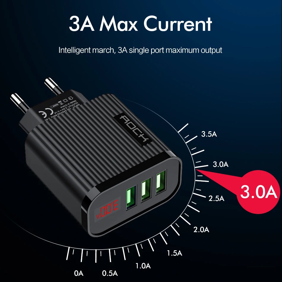 Настенное зарядное устройство ROCK с цифровым дисплеем, 3 порта USB 3A, умное быстрое зарядное устройство для путешествий, адаптер для iPhone, Samsung, Xiaomi