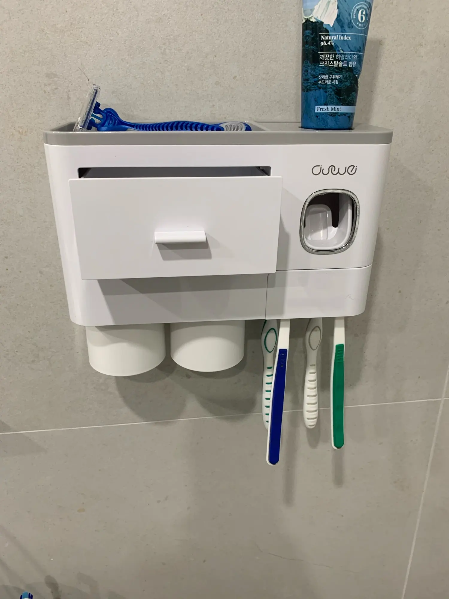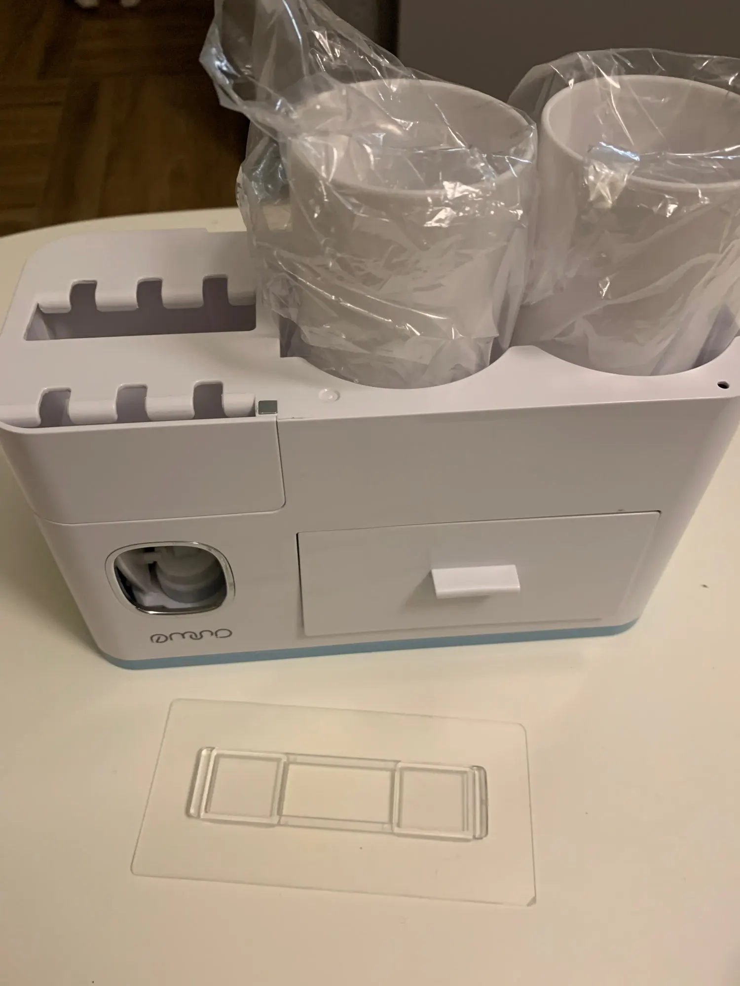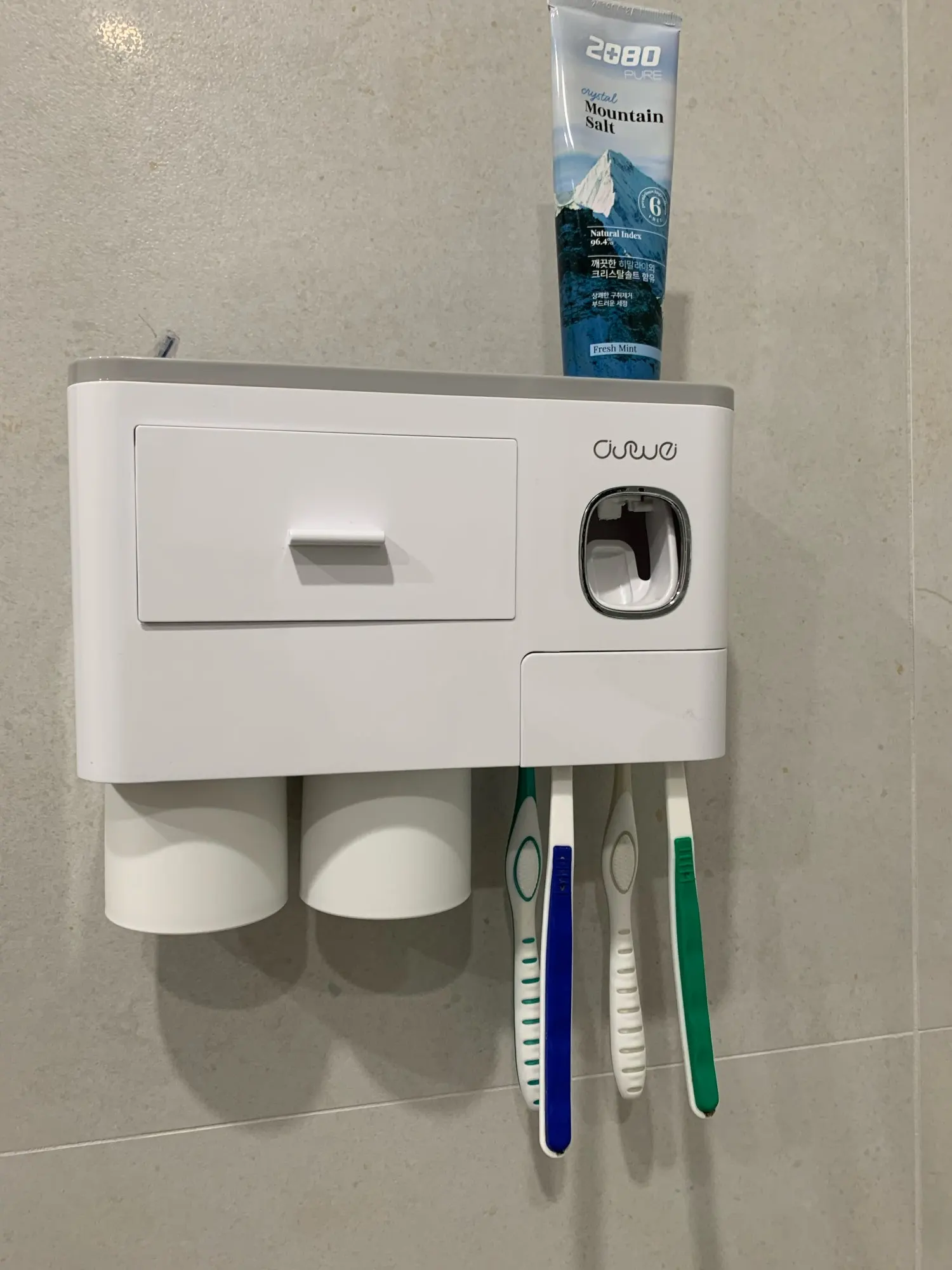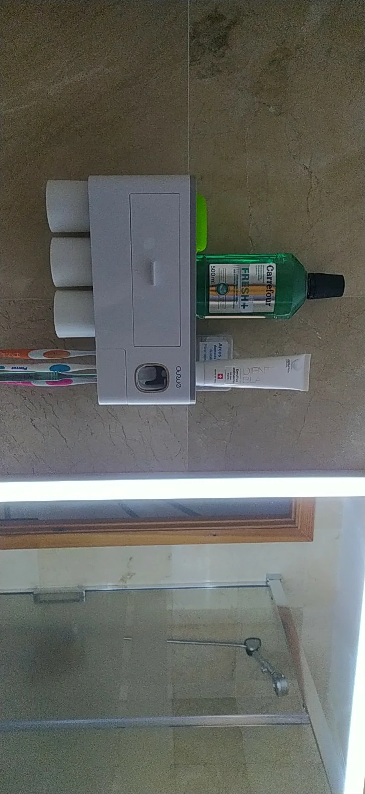 Это здорово. Очень легко установить, сначала я думал, что стикер будет удален с стены при размещении прибора, из-за давления, но это не было. Он очень хорошо цепляется (я оставляет наклейку на стене в течение нескольких минут, на всякий случай, перед установкой). Очень компактный и компактный. Идея подвесить очки с магнитом очень хорошая. Зубная паста прессована и, для заливки пасты в щетку, хорошо дозирует ее. Он не выпадает слишком сильно, слишком быстро или протекает. Он пришел хорошо вовремя и очень хорошо обернут. Без повреждений. Я очень доволен и буду покупать больше у этого продавца.